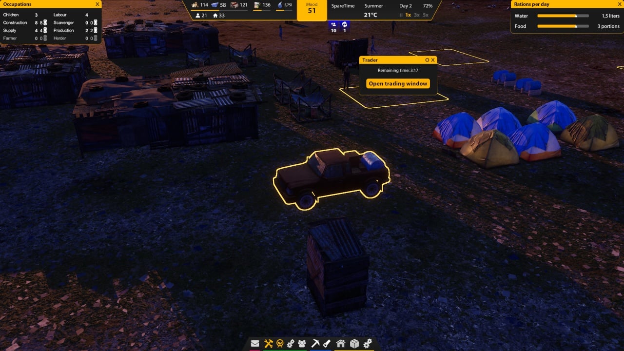 Строительство новых зданий, как и остальная игра, происходит в изометрическом виде. Такая камера предоставляет отличный обзор на поверхность земли и территории вокруг лагеря, что позволяет продумывать дальнейшие апгрейды и направление развития убежища. Собирая запасы для хранения на складе, их можно продавать странствующему торговцу за местную валюту или производить обмен на взаимовыгодных условиях.