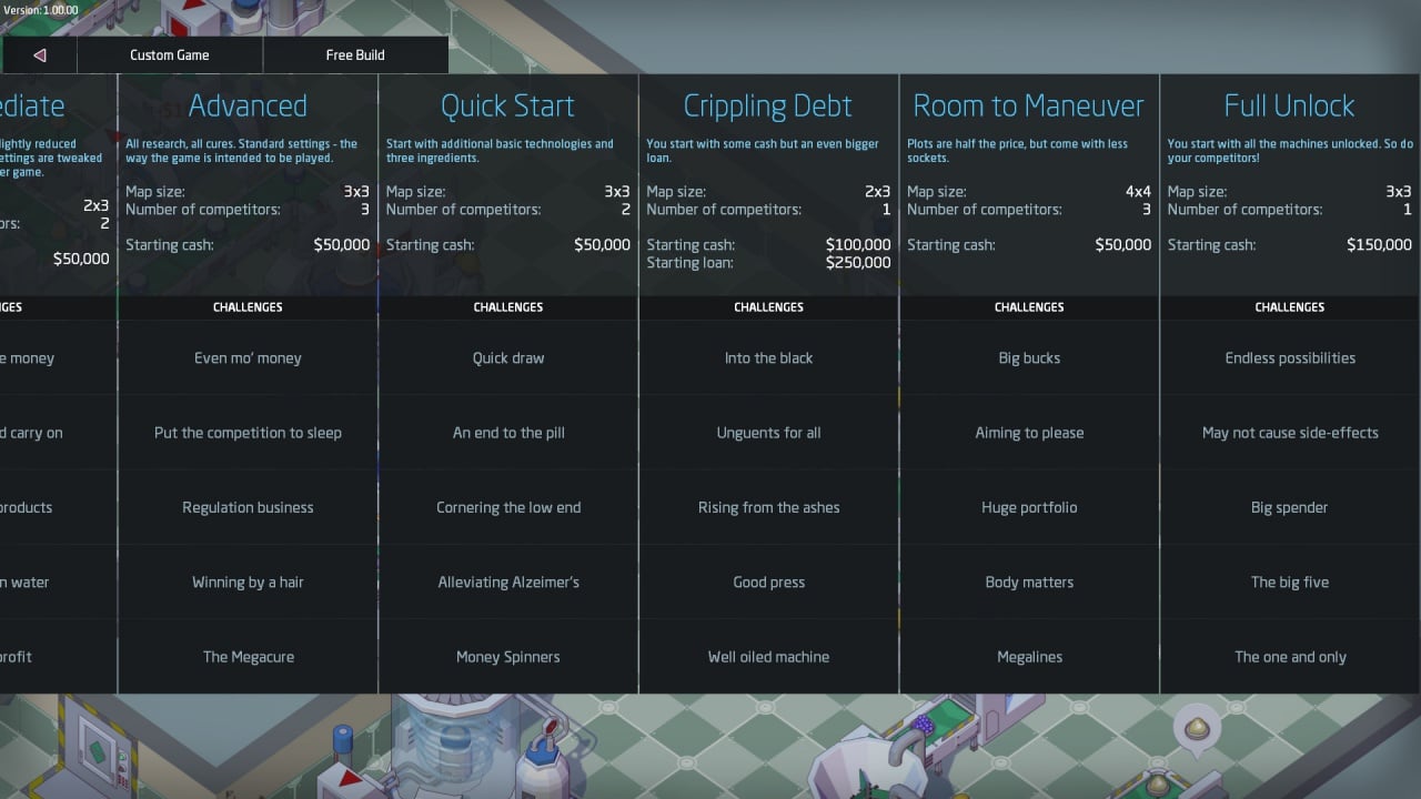 Начинается путь с небольшой компании, которая занимается производством препаратов от легких недугов. Постепенно расширяясь, вы будете закупать новое и передовое оборудование, которое позволит при помощи высокотехнологичных машин исследовать новые виды болезней, разрабатывать передовые лекарства и полностью изменить мир к лучшему.