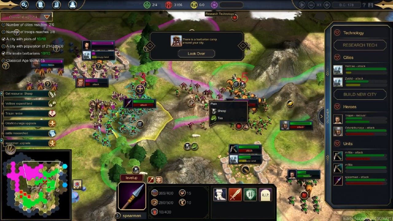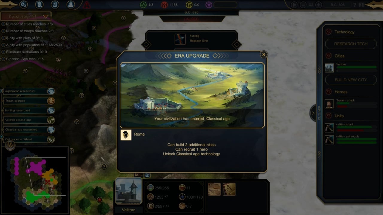 Технологии выступают основным источником смены строя города и развития жителей. Посредством новых технологий можно улучшать армию, производство и многое другое. Чтобы вступить в новую эру, необходимо закончить череду квестов. На выбор доступно несколько героев, каждый из которых имеет свои особенности и бонусы.