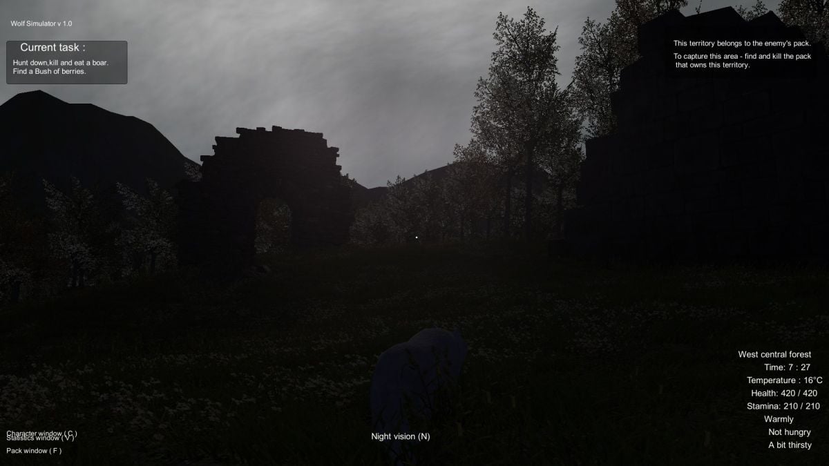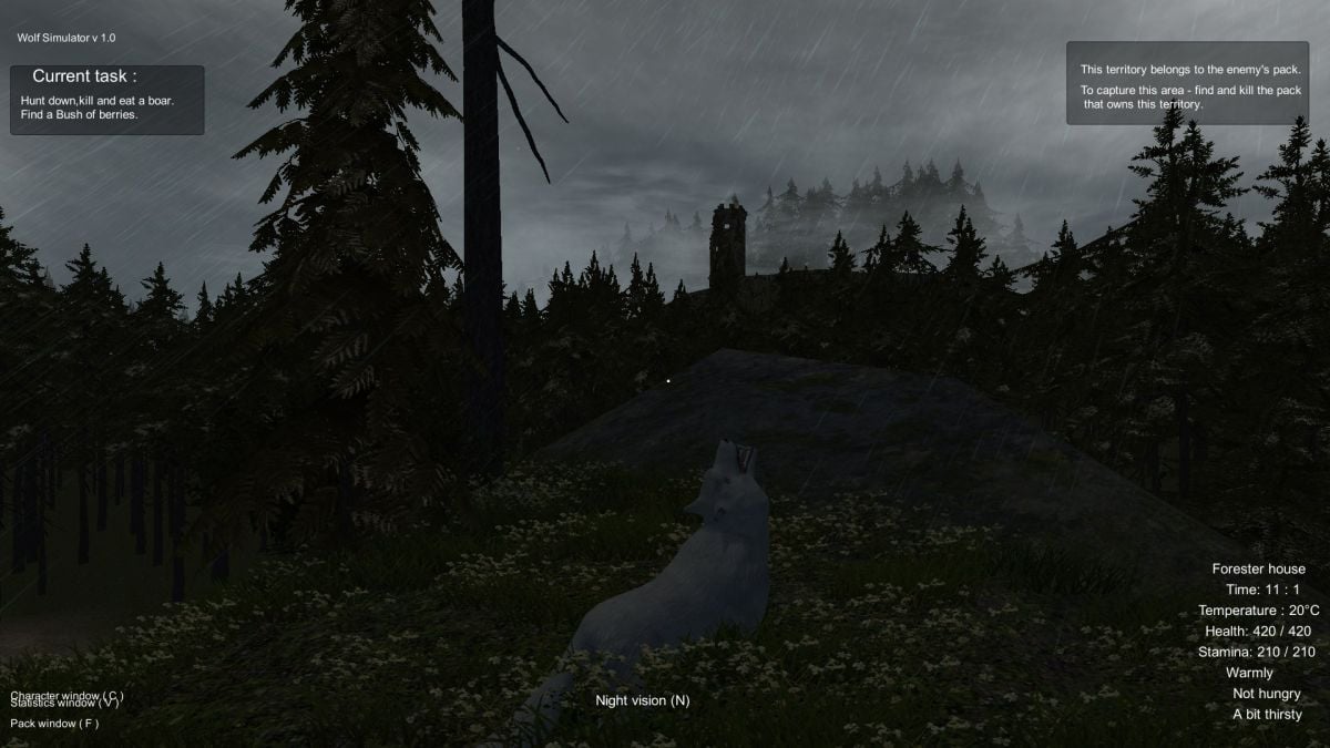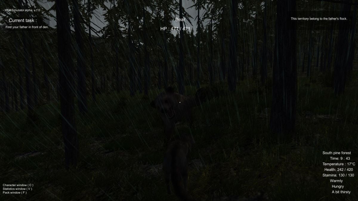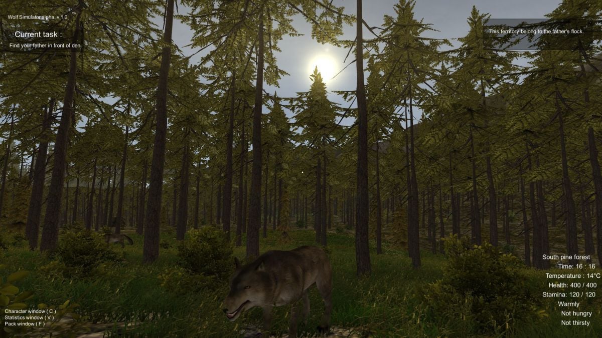 Мир вокруг вас - интерактивен. Присутствует динамическая смена погодных условий и времени суток. Во время ливня необходимо искать убежище, чтобы спрятаться. Геймплей Wolf Simulator включает элементы хоррора и саспенса. Оставшись в ночном лесу, вокруг поджидает огромное количество опасности. Старайтесь пережить каждый новый день, подкидывающий испытания. Территория представлена лесом и поляной, которую можно захватить или защищать от враждебной фауны - выбор за вами. Выживание симулируется на основе таких показателей, как здоровье, усталость, жажда, голод, температура тела и окружающей среды. Протагонист может легко заболеть и умереть. Объединяйтесь с другими волками, чтобы дать отпор людям, медведям и другим хищникам. За время прохождения предстоит ухаживать за маленькими волчатами. Игра основывается на реальном быте волков и показывает все стороны существования этих жителей планеты.