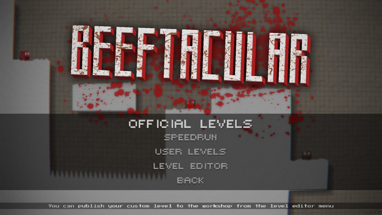 В Beeftacular около 100 официальных уровней. Они открываются постепенно. В конце забега подсчитывается общее время, пройденная дистанция (в пикселях), количество убийств и комбо, число простых и обычных прыжков, а также отскоков. На основе этой информации юзеру выдают глобальный ранг. Есть редактор и пользовательские карты. Для кампании можно выбрать сложность – от нубской до опытной. Для спидраннеров разработчики создали отдельный режим.