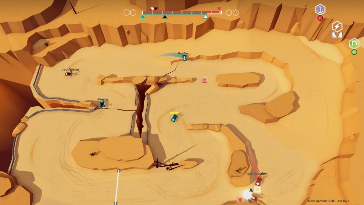 От каждой противоборствующей команды выступает по одному гонщику, преследующие цель - добраться к финишной полосе раньше соперника. Остальные два участника команды должны всячески мешать противнику: устанавливайте шлагбаумы, поднимайте и опускайте платформы, пытайтесь подрезать соперника, скинуть со скалы и т.д. Только совместными усилиями можно одержать победу!