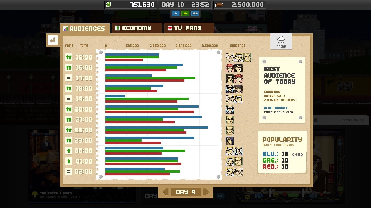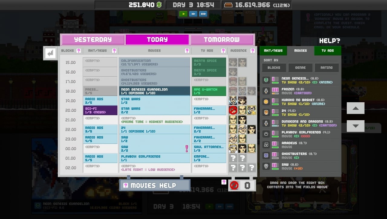 Тут нужно одновременно подстраиваться под аудиторию, рекламщиков и артистов. Последние могут плохо справляться с ролями, если не следить за уровнем их счастья. Реклама бывает для широких масс или нишевая. При этом стоит правильно заполнять блоки и выполнять задачи в сроки. В случае неудачи рекламные агентства потребуют выплатить штраф.