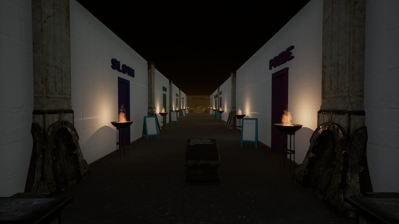 Если же Билли пожелает найти своих друзей и выход из этого места, как раз начнется самое интересное – элементы платформера и квеста. Сперва нужно найти проход в стене, о котором упоминал демон, потом достроить к нему лестницу из коробок. Следующая локация – повисшие в воздухе над лавой обломки камней и лестниц. Геймер аккуратно перепрыгивает на противоположную сторону локации и оказывается перед гигантскими воротами, запертыми на кодовый замок. Чуть поодаль валяется скелет, возле которого обнаруживается и подсказка для получения пароля к двери. А после этого парень попадает в коридор с 7 комнатами, символизирующими все смертные грехи – Похоть, Лень, Чревоугодие, Гнев, Зависть, Алчность и Гордыня. Чтобы продвинуться дальше, нужно найти предметы, олицетворяющие эти злодеяния, принести их скорбящему ангелу. А дальше еще непонятнее, подсказки становятся все туманнее, а избегать адских ловушек становится все труднее.