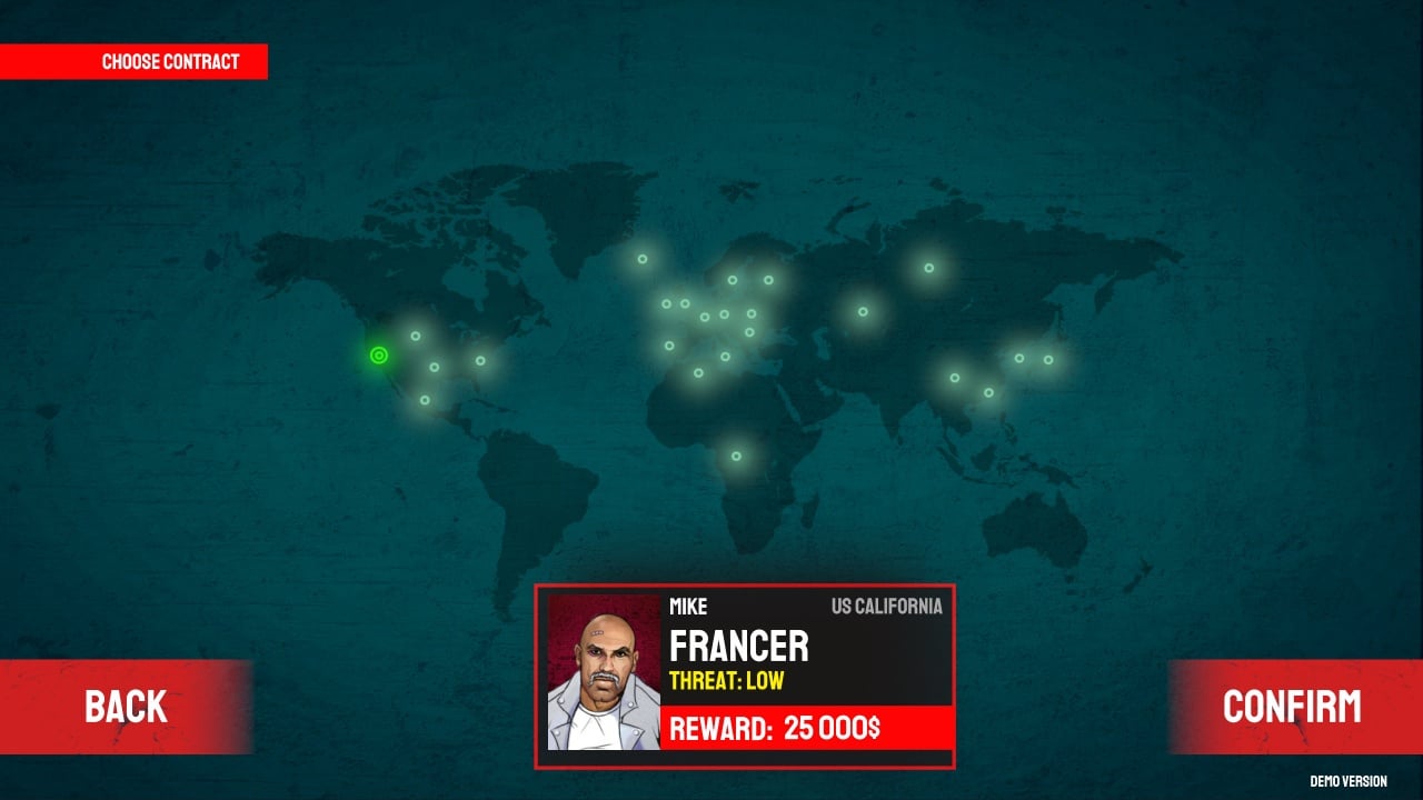 Главный персонаж может путешествовать по всей карте, каждая из которых представляет собой одну главу. Всего в Contract Killers доступно 24 территории, которые по ходу прогресса игрока открываются для изучения. Помимо стандартных и однообразных миссий, встречаются дополнительные задания. Например, геймеру придется отстреливаться из машины на ходу, убивать толпы вражеских бойцов и подкладывать взрывчатку. Проходя локации, игрок получает виртуальные деньги, которые можно тратить на прокачку снаряжения и покупку новых смертоносных пушек.
