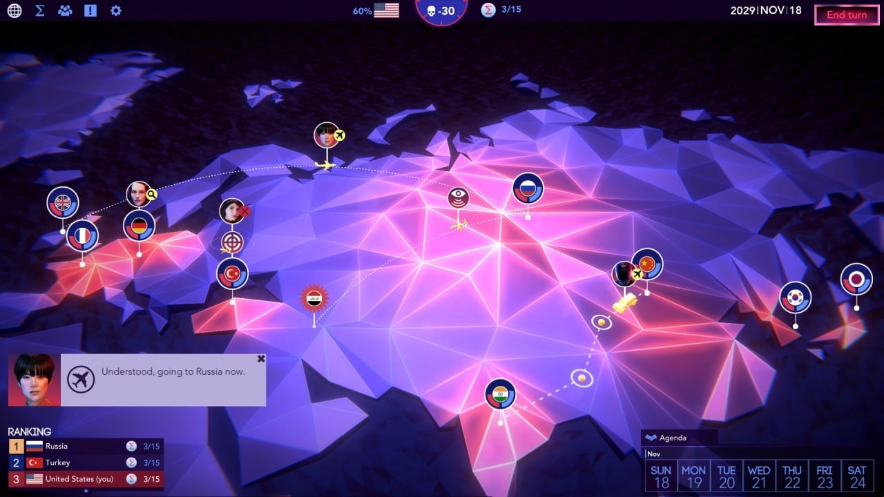 Процесс вербовки агентов выстроен в виде выбора реплик в диалогах. При правильных ответах игрока специалист согласится вступить в его группу. Набранных оперативников нужно отправлять в другие страны. Они будут заниматься шпионской деятельностью: собирать компромат, искать научных сотрудников, красть информацию, похищать или устранять важных лиц и т. п. События в Sigma Theory: Global Cold War развиваются в пошаговом режиме. Иногда операция может сорваться. Тогда геймеру предложат подсказывать конкретному подопечному, как оторваться от преследователей.
