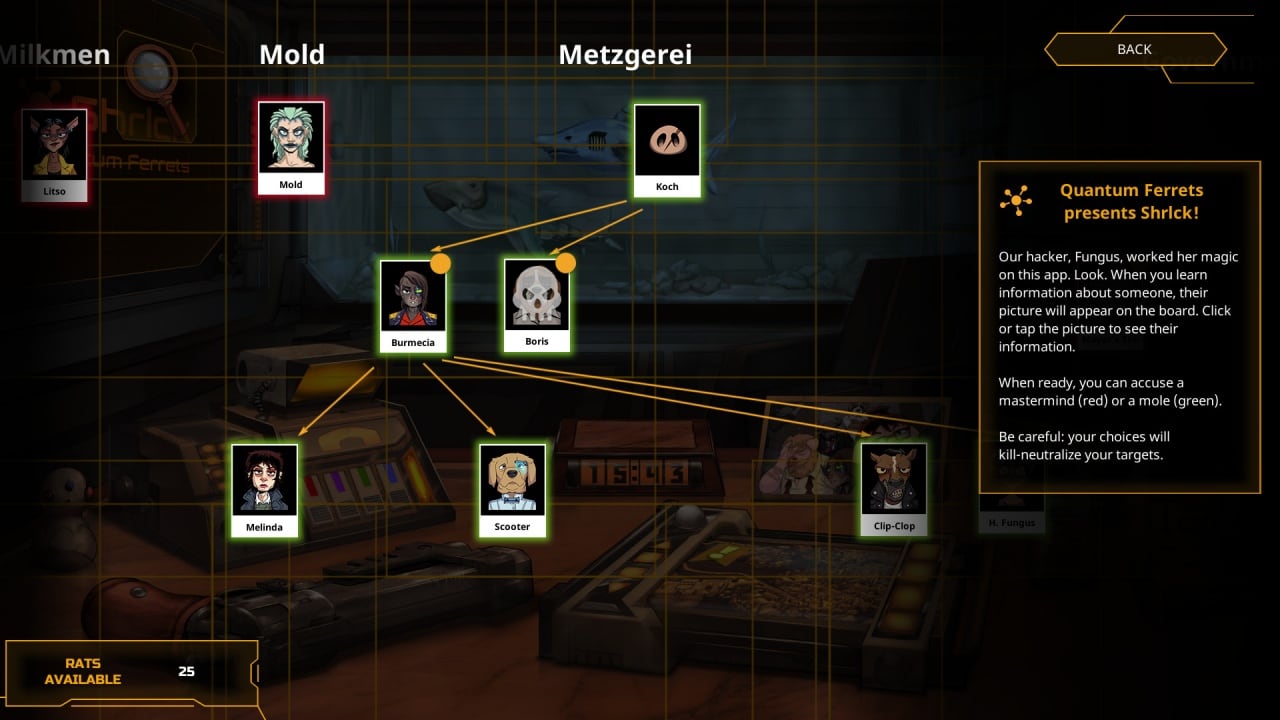 Однопользовательская кампания продолжается на протяжении 6 игровых дней. Именно такое количество времени есть у геймера, чтобы поймать "крысу", которая засела где-то в ближайшем окружении главы мафии и сливает всю важную информацию, что знает сама. Придется проводить допросы, нанимать следователей, пытать тех, кто каким-либо образом провинился и попытаться выследить предателя и устранить его до того, как он сможет разрушить структуру изнутри. Персонажи семьи обладают собственными характеристиками, подходящими под выполнение разных задач. Правильное их использование практически гарантирует успех операции.