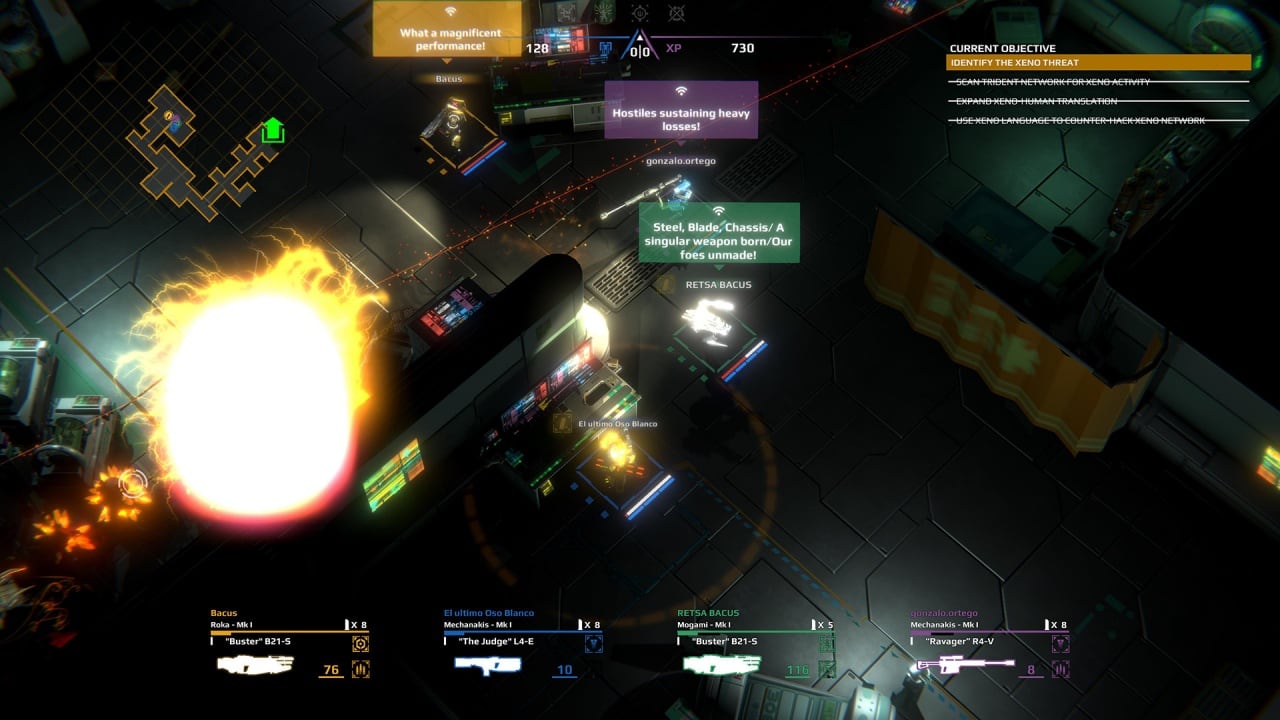 Всего на выбор игроку предоставляют 4 вида роботов для управления и сопровождения. Каждый персонаж обладает своими навыками и умениями, активными и пассивными. Например, Москва создает защитный барьер для всего отряда и способен регенерировать, а Могами мгновенно телепортируется в самую гущу врагов и так же быстро возвращается обратно, под прикрытие. Модифицировать и усиливать своего персонажа можно и нужно, ведь чем выше ранг, тем больший набор умений становится доступным к использованию.