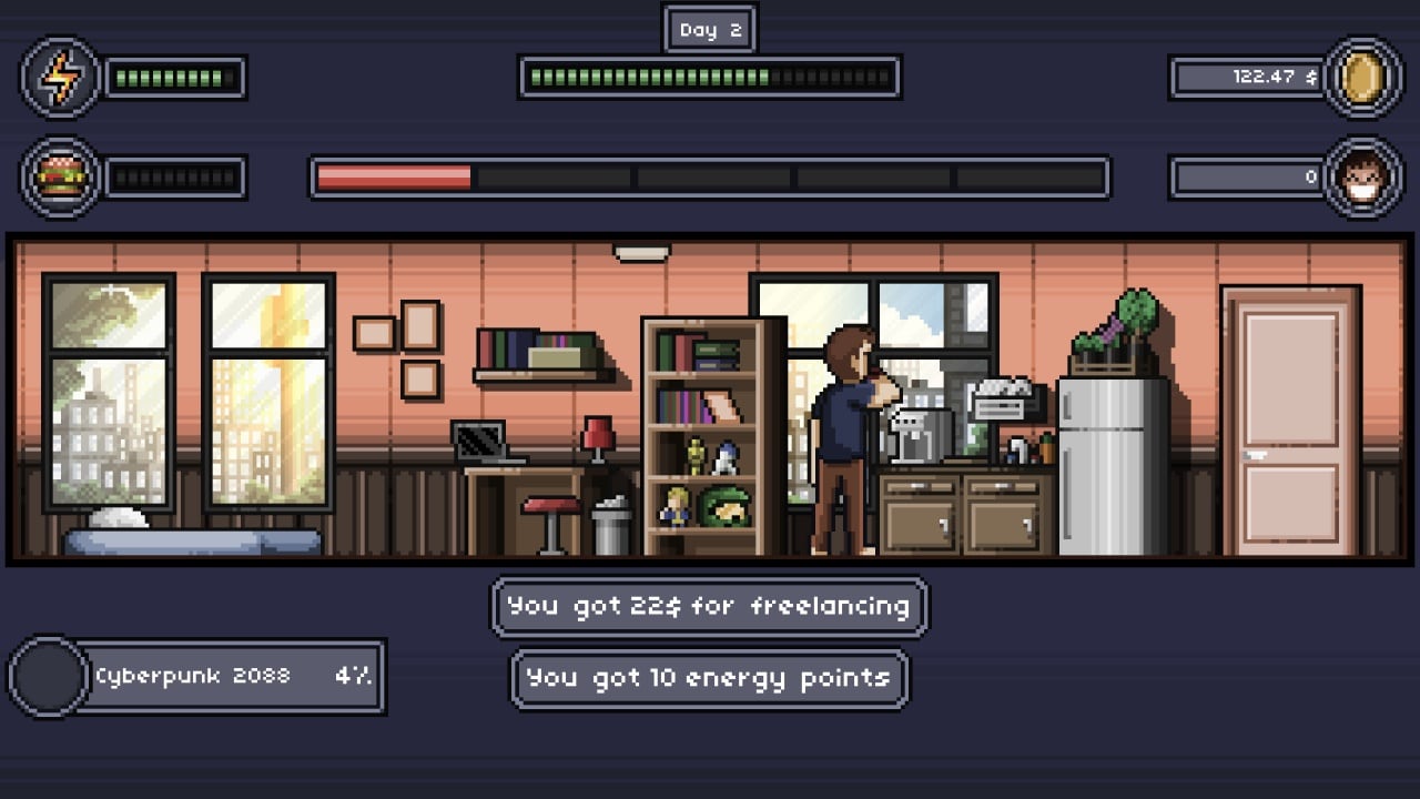 В Indie Dev Simulator присутствует система энергии, которая тратится при любом действии геймера, даже открытии дверей. Также нужно следить за показателями сна и сытости, распределяя время на нужды. Со временем появится возможность покупать более дорогие вещи, обустраивать квартиру, питаться более качественной едой. Но все эти усовершенствования произойдут только после коммерческого успеха произведений. А после, тратьте на желаемые вещи, но не забывайте, что деньги заканчиваются быстро, а для стабильного дохода необходимо популяризировать свой контент.