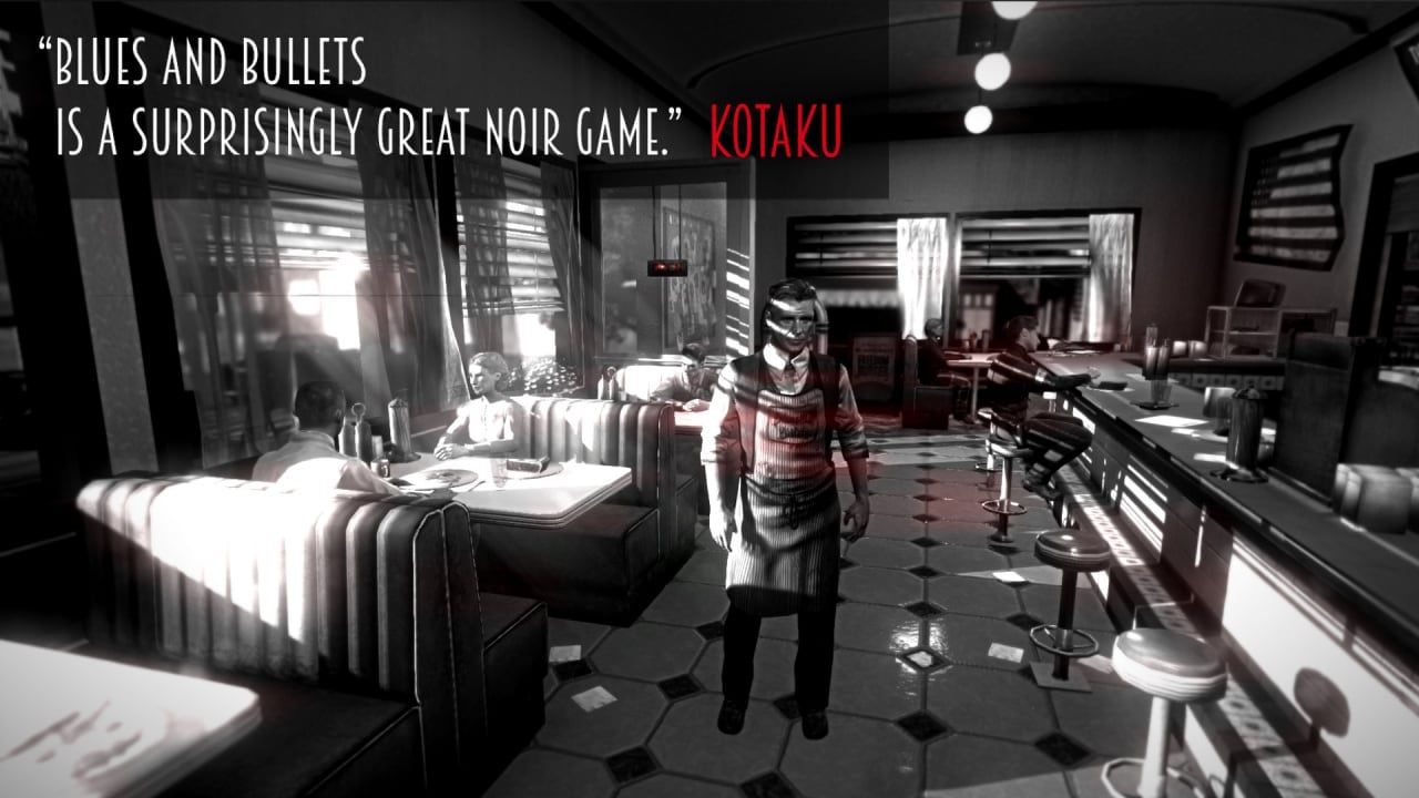 Blues and Bullets – квест-адвенчура с огромным количеством заставок на движке игры, раскрывающие сюжет более детально. Всё повествование разделено на главы для лучшего восприятия происходящего. Каждая сцена интерактивного кино имеет места, где игроку предложено выбирать реплику, сказанную главным героем, что создаёт небольшие отличия. Достоинством станет удобно реализованное управление с помощью как мыши и клавиатуры, так и геймпада. Игра использует необычную стилистику – мрачный город, выполненный в темных тонах, с использованием лишь белого и чёрного цвета, с редким вкраплением красного и других оттенков, подчёркивающего важные детали.