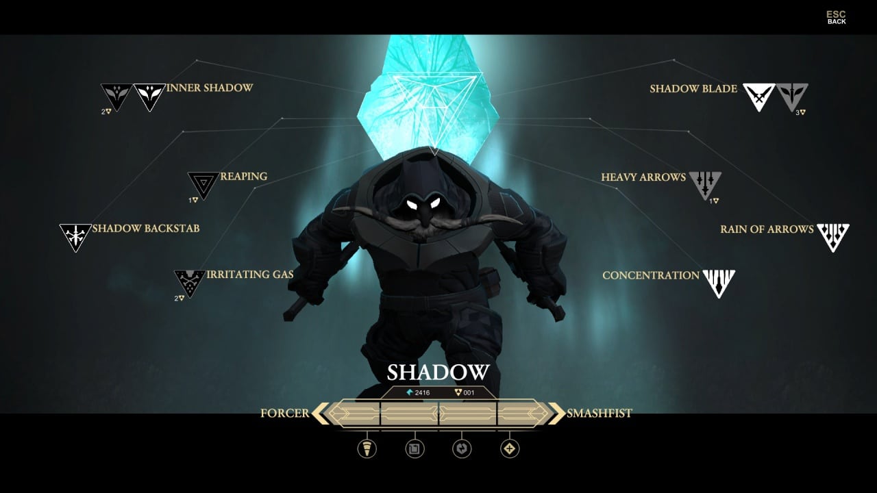 - Shadow – убийца, скрывающийся в тени. Обладает скрытными способностями, и предпочитает устранять недругов, не привлекая к себе внимание. Также не оставляет после себя следов расправы.