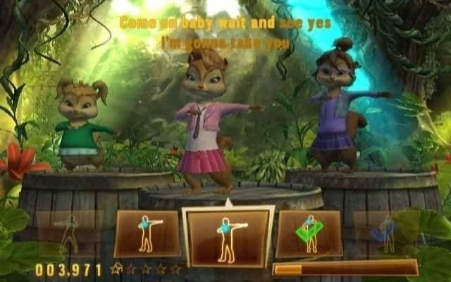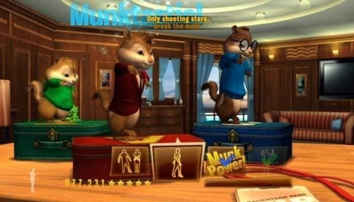 В процессе прохождения нужно просто нажимать на цветные звездочки, и попадать в такт музыке. Здесь можно нечаянно пропустить пару звезд, на ход игры это не сильно повлияет. Если пользователь будет делать все правильно, то получит особые комбо: на сцене будет появляться пламя, фейерверки и многие другие эффекты. В Элвин и Бурундуки есть все, что необходимо для отличного концерта: ударные установки, фейерверки, соло-гитары и тройка прелестных зверьков с милым писклявым голоском. Репертуар юных певцов состоит из четырех десятков известных песен.