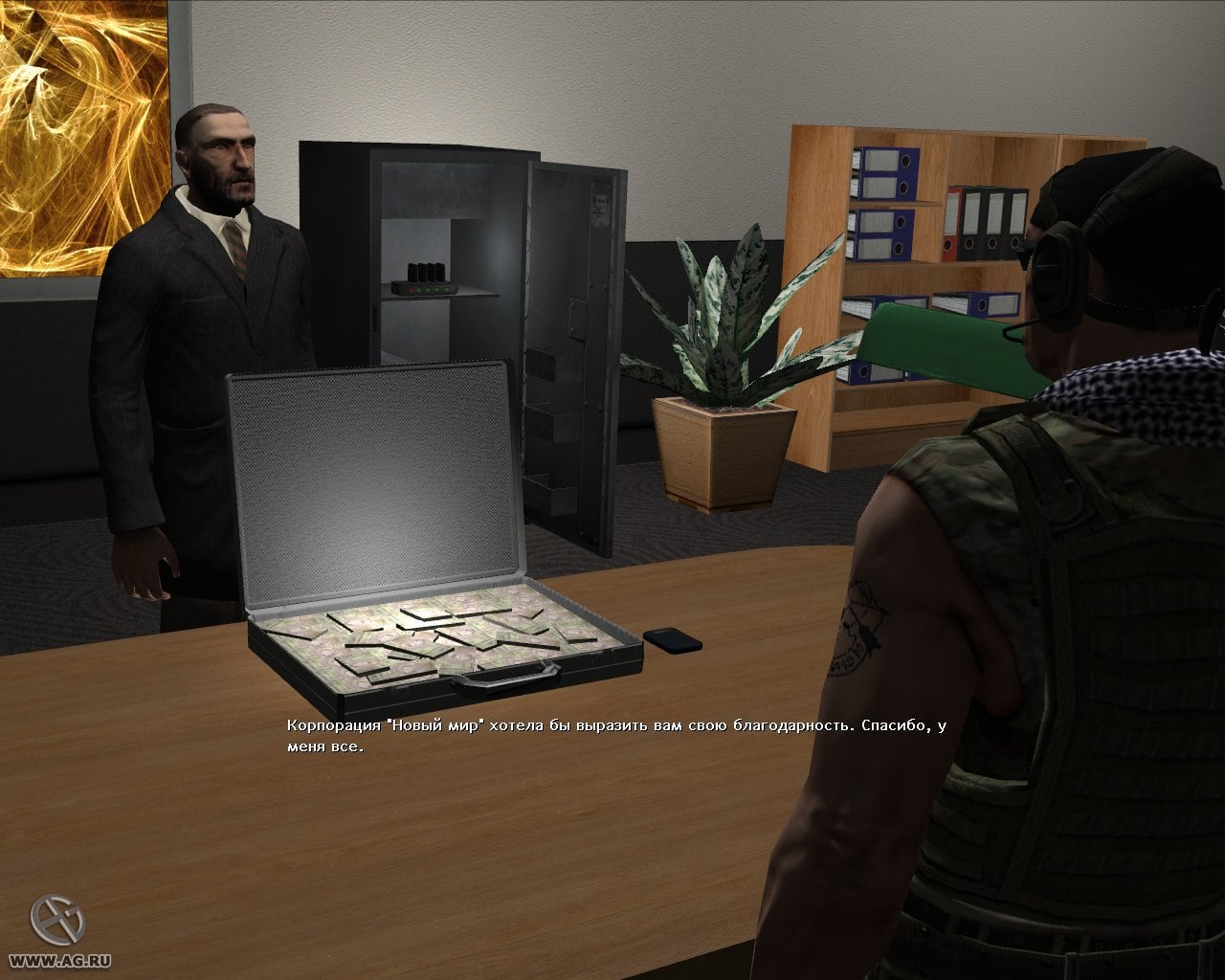 Вместе со своей группировкой, которая обладает отличным вооружением, пользователь отправится в небоскреб, захваченный террористами. Здесь солдат ждет масса испытаний, в том числе, проверка командной работы и доверительных отношений между ее членами. Деньги способны затуманить разум даже самых преданных людей. Боевые действия в Наемники. Бизнес под прицелом осуществляются в самом здании. Игрока ждут массовые перестрелки на лестничных площадках, в офисах и коридорах. Важно научится действовать совместными усилиями, чтобы получить минимальные потери и выполнить миссию.