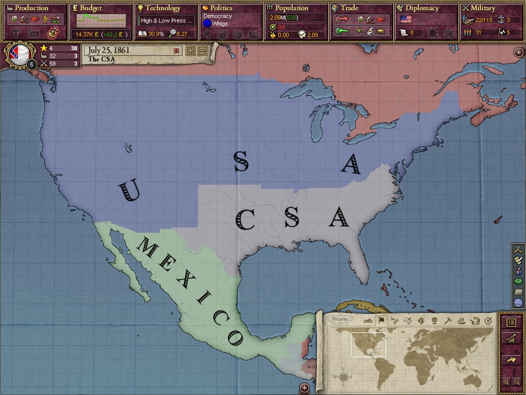 Victoria 2: A House Divided - первое дополнение к глобальной одноименной стратегии, посвященное гражданской войны в Соединенных Штатах. Необходимо провести нацию от абсолютной монархии XIX века до Великой Державы на расцвете XX века.