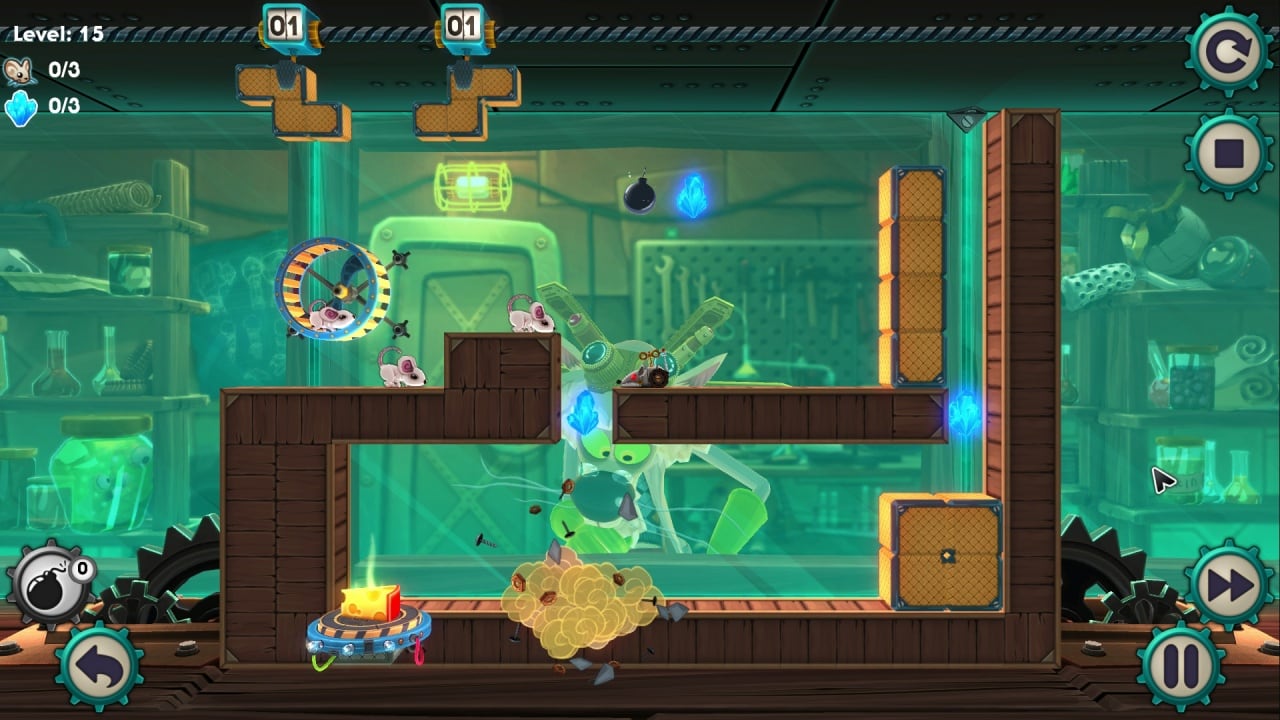 Для прохождения уровня от начала до конца нужно использовать разнообразные формы тетрамино. Путь устроен так, что изначально он не проходим, места, которые мыши не преодолеют, будут отмечены синими кристаллами. Но при правильном использовании фигур, знакомых всем по тетрису, мыши смогут взобраться по ним, минуя обрывы и ямы, кислотные и электрические ловушки.