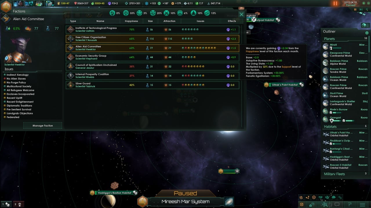 - полноценная система лидера, позволяющая принимать указы, устанавливать гражданские права, стать лучшим дипломатом в галактике или самым грозным воинствующим диктатором.