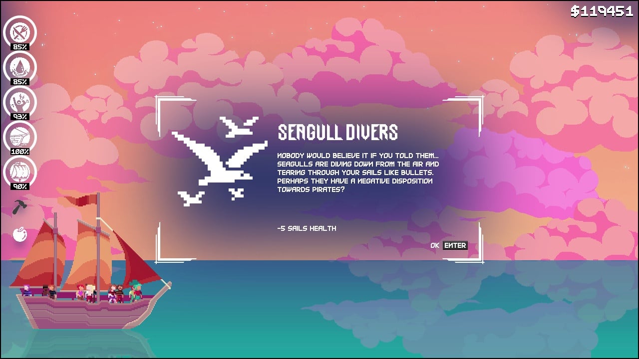 И всё же, основная механика игры направлена на морские путешествия. Корабль необходимо обслуживать и постоянно модернизировать – помимо того, что он нужен в качестве транспортного средства, его пушки решают, кому из пиратских главарей достанется добыча. Команда тоже влияет на развитие событий – матросы с плохим самочувствием не только снижают скорострельность орудий, но и могут попросту самоликвидироваться, выпав за борт.