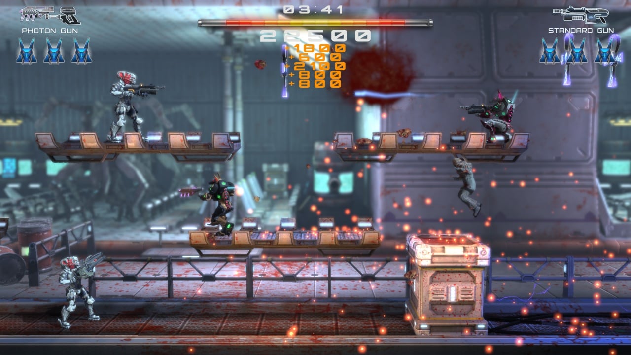 Основной задачей будет перестрелять всех злодеев и добежать до конца локации. Сам геймплей состоит из 10 эпизодов, в каждом из них есть 3 уровня сложности. На первом и втором уровне требуется уничтожить всех врагов и дойти до точки сброса, которая открывает нам дальнейший путь. Следом открывается третий уровень, в нём основной задачей является уничтожение босса, который выполнен в уникальном стиле и соответствует жанру данного шутера. Уровень сложности в игре достаточно высокий, а для более эффективного прохождения можно скооперироваться с друзьями по сети, но также на протяжении матчей можно красть его здоровье для своих индивидуальных целей.