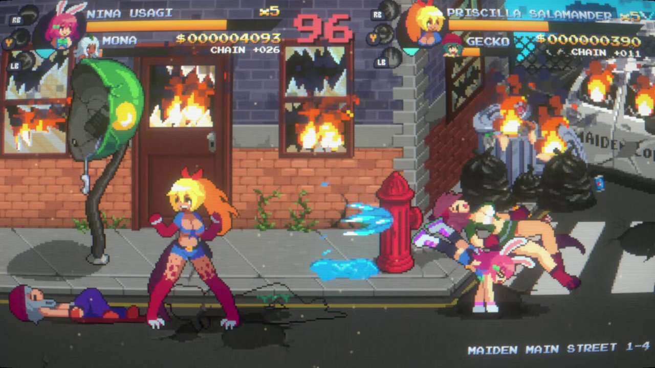 Maiden Cops – это аркадный битэмап с олдскульным геймплеем. Его двухмерная пиксельная графика стилизована под аниме. История повествует о буднях девушек-полицейских из частной охранной корпорации. Они противостоят преступной организации "Освободители" в городе Мейден-Сити. Эти бандиты сеют вокруг себя насилие и хаос, желая лишить жителей их свобод. Сюжетную кампанию можно проходить не только в одиночку, но и вдвоем. Мультиплеер здесь только локальный. Присутствует выбор сложности. По мере прохождения открываются новые скины на персонажей. Также можно разблокировать предметы, арты и музыку. Геймплей выглядит следующим образом. Женщины-копы бродят по улицам и зданиям, сражаясь с превосходящими силами противника. Обычно их запирают на экране с врагами. После победы над недругами можно двигаться дальше. Есть возможность ломать некоторые объекты. Здоровье восполняется с помощью еды (у каждой протагонистки есть свои предпочтения). Уровни с рукопашными схватками разбавляются гоночными этапами, где дают покататься на мотоциклах и автомобилях.