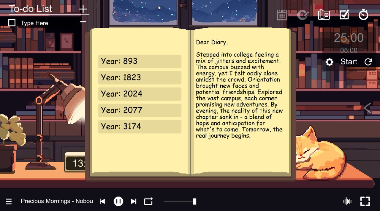 По мере прохождения игры вы будете открывать новые окружения, саундтреки и функции, чтобы ваше путешествие к продуктивности было увлекательным и полезным. На заднем плане разворачивается тонкое повествование, добавляющее глубину вашему опыту и не мешающее сосредоточиться. Так что откажитесь от традиционной комнаты для занятий и откройте для себя мир - место, где продуктивность встречается с иммерсивной средой. Но это не просто красивые декорации. Каждое окружение может похвастаться своим собственным тонким повествованием, разворачивающимся по мере того, как вы работаете. Завершите задание, и история продолжится. Нужен перерыв? Окружающие звуковые ландшафты, тщательно подобранные в соответствии с обстановкой, омывают вас, помогая сосредоточиться и расслабиться. Думайте об этом, как об учебе с другом, который время от времени подбрасывает вам расслабляющую музыку и интересные истории.