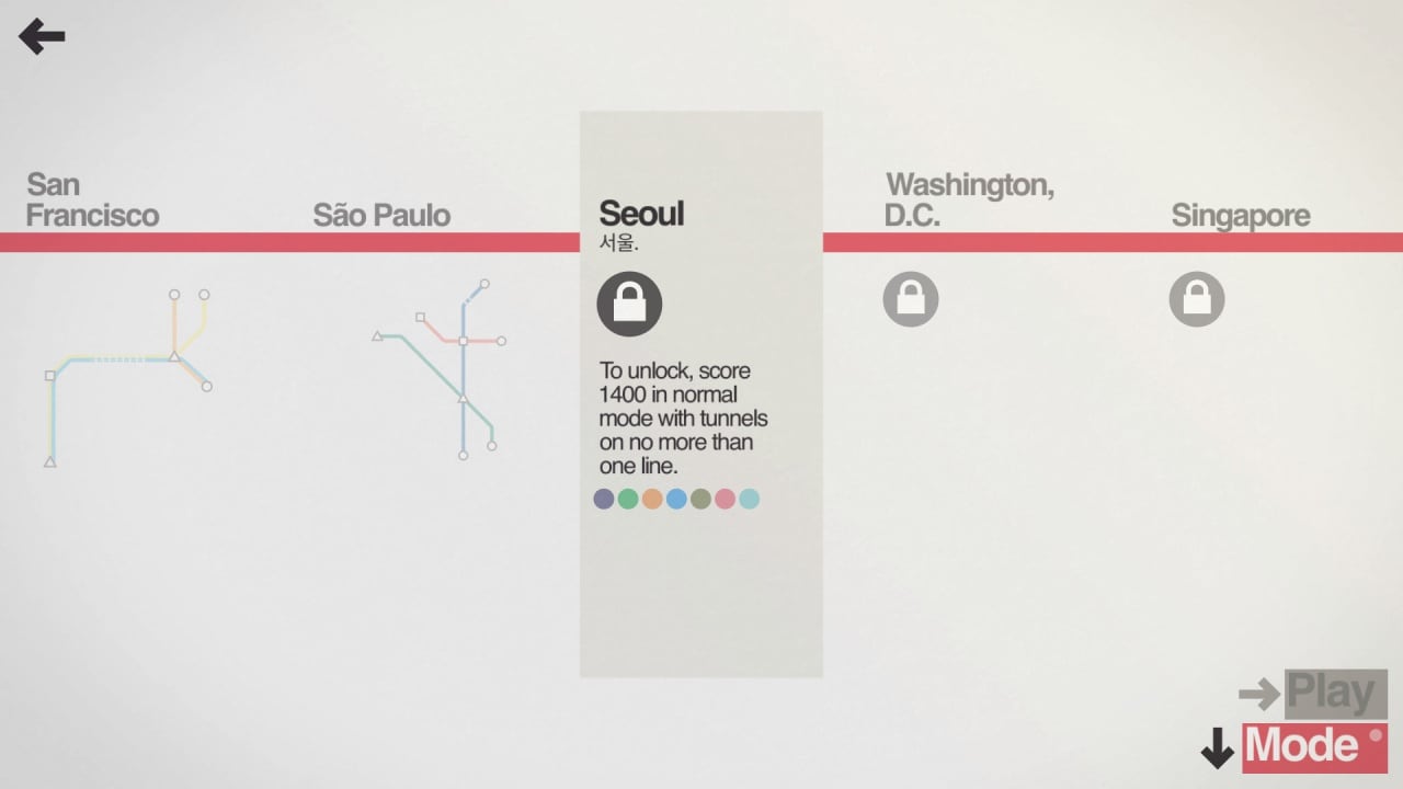 Симулятор метро состоит из 12 разных уровней, на которых смоделированы реально существующие города - Париж, Лондон, Нью-Йорк, а остальные открываются в процессе. Например, если в одном из мегаполисов суметь перевезти две сотни людей, то открывается Берлин. Особенности каждого города влияют на геймплей: открыв Осаку, можно использовать скоростной транспорт - "Синкансэн", а в Каире в городском транспорте вмещается намного меньше человек.