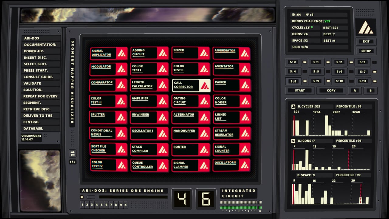 ABI-DOS - это головоломка, в которой геймерам предстоит проектировать и создавать сложные системы, используя вымышленный язык программирования, похожий на ассемблер. Адвенчура представляет собой уникальное сочетание логики, творчества и решения задач, где целью является манипулирование схемами, управление цифровыми блоками и выполнение определенных требований. Перед игроками стоит задача разработать сложные схемы микросхем, которые должны соответствовать строгим операционным и пространственным ограничениям, создавая решения от простых до весьма замысловатых.
