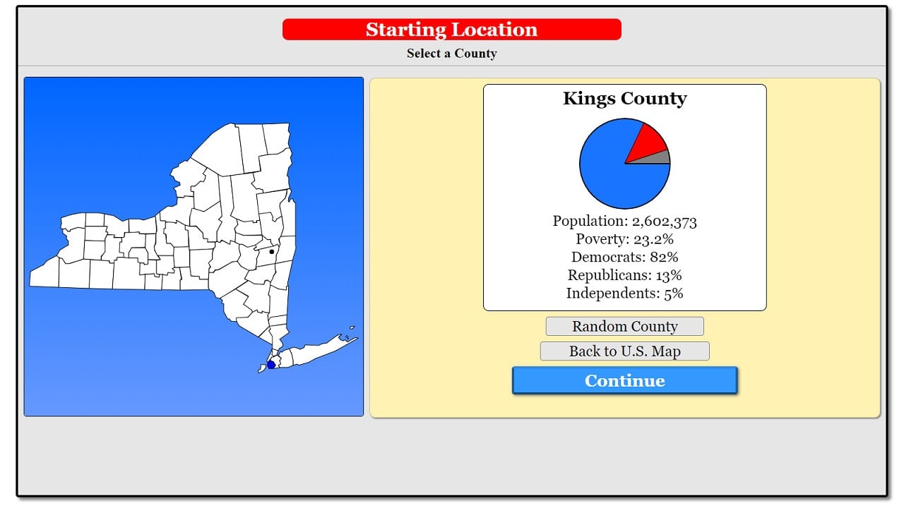 Доступен любой из 50 штатов Америки и около 3000 округов, откуда вы можете начать свою карьеру. Все районы по-своему уникальны и люди представляют разные взгляды на ситуации. Каждый штат имеет около 80 переменных: демографические данные, идеологию, явку избирателей, население округа, уровень бедности и т.д.