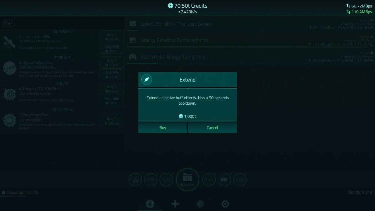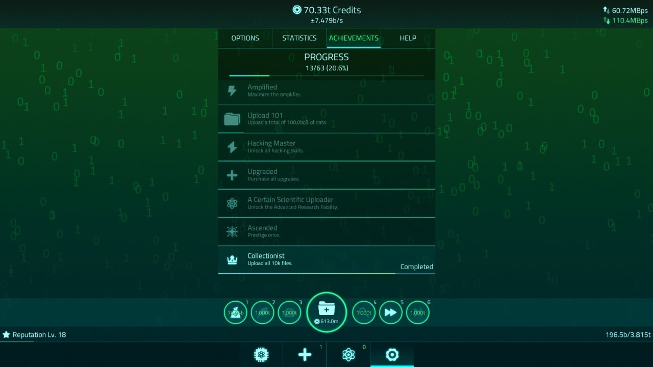 Это симулятор аплоадера. В US геймер загружает игры (у них выдуманные и пародийные названия) в интернет и зарабатывает на этом деньги. Также он постепенно повышает свою репутацию. Помимо этого юзеру доступна возможность майнить крипту. Чтобы увеличить прибыль и ускорить процесс её получения, игрок может проводить исследования и апгрейдить собственное оборудование. Можно поставить более быстрое интернет-соединение, увеличить объем файловых хранилищ и так далее. Инди-проект не сильно претендует на реализм. Поэтому в нём пользователю ещё позволяют обеспечивать самого себя электроэнергией, а также заняться производством собственных компонентов и их разгоном. Ещё тут есть рандомные артефакты, дающие полезные бонусы.