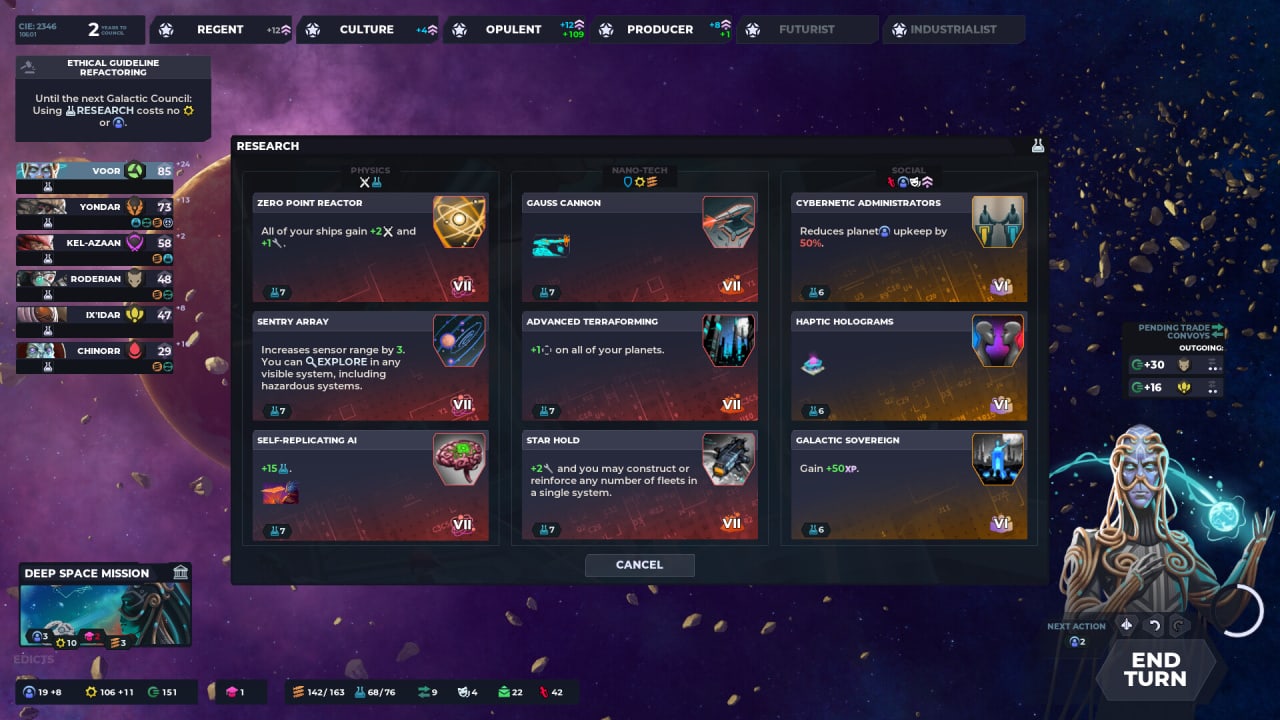 Nexus 5X - стратегия-блиц для занятых покорителей космоса - забудьте о масштабных кампаниях, которые съедают все выходные. Геймплей сжимает эпическую сагу о завоевании межзвездного пространства до часовых отрезков, позволяя вам насладиться стратегической глубиной космической оперы 4X без ущерба для драгоценного свободного времени. Погрузитесь в быструю перестрелку с семью друзьями, каждый из которых будет командовать уникальной фракцией и лидером. Альянсы будут складываться и разрушаться, предательства будут жалить, а подлость превратится в искусство, пока вы будете маневрировать по галактике, борясь за главный приз - галактический престол Нексус.