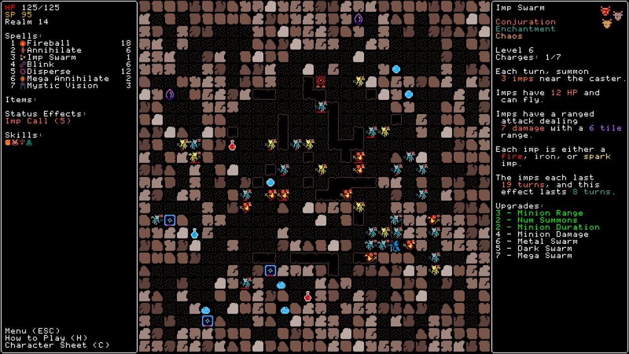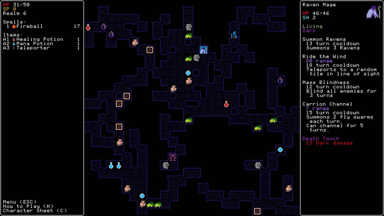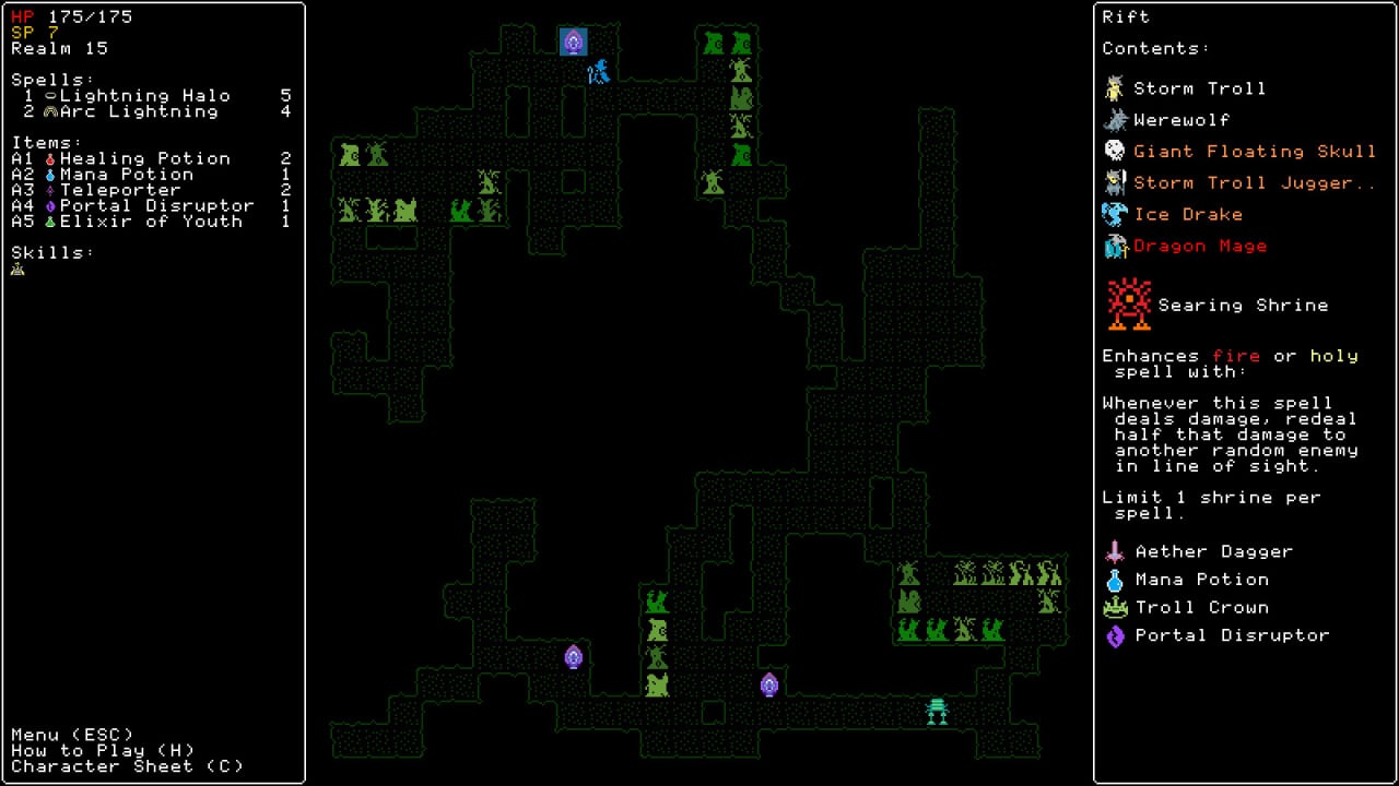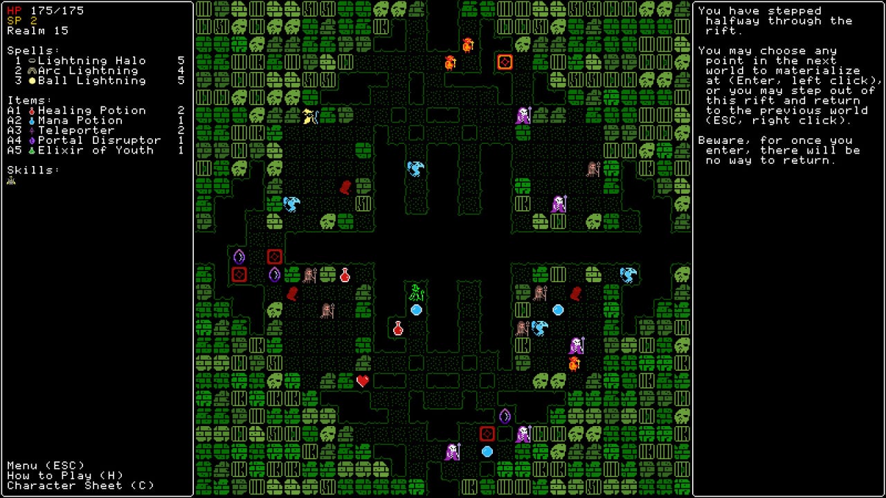 В Rift Wizard всё окружение двигается одновременно с пользователем. Как только юзер сделает ход, все находящиеся на экране монстры сдвинутся вместе с ним (или предпримут иное действие). Эта игра предлагает управлять магом. Для изучения доступно 100 заклинаний. Их также можно улучшать. Помимо этого колдун получает пассивные умения. Всё это вместе позволяет создавать различные билды.