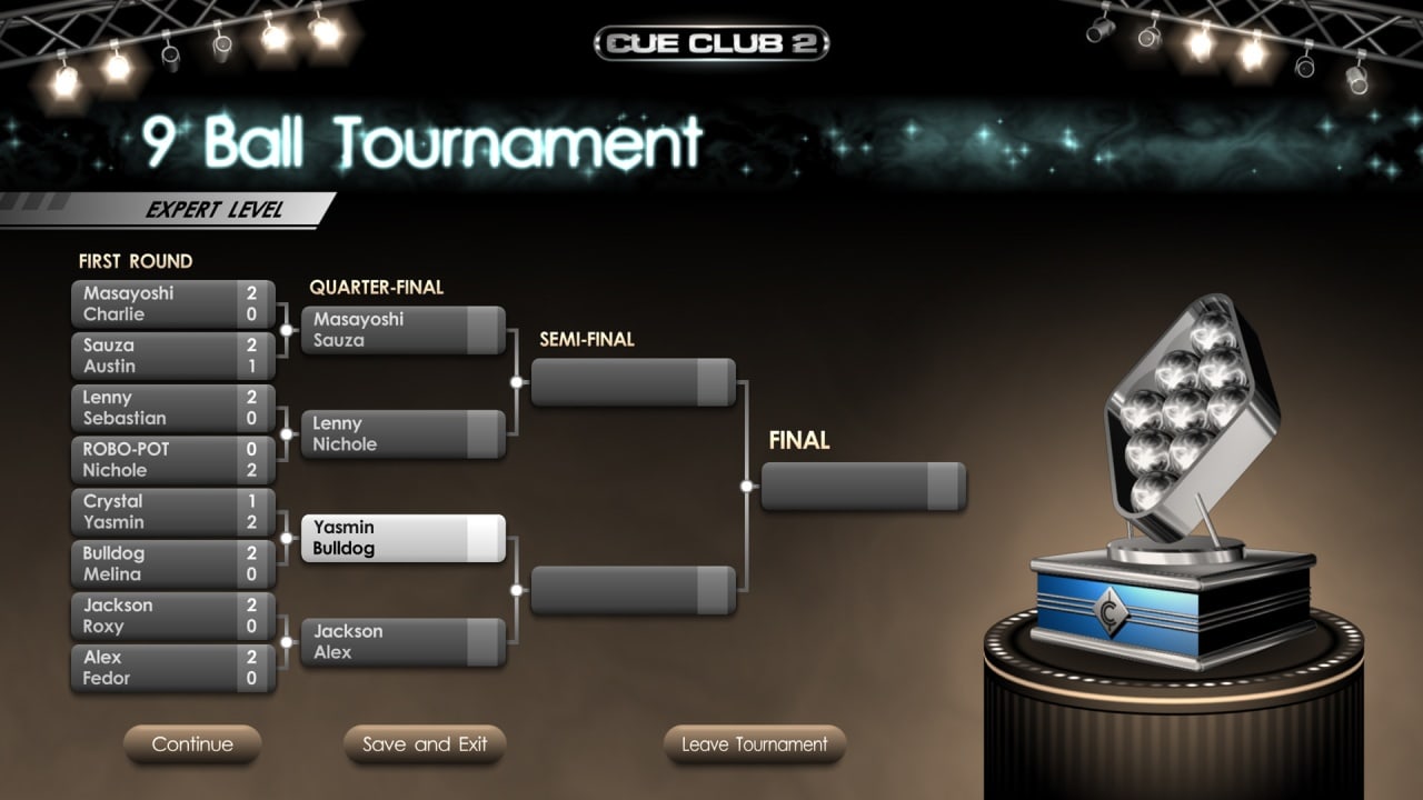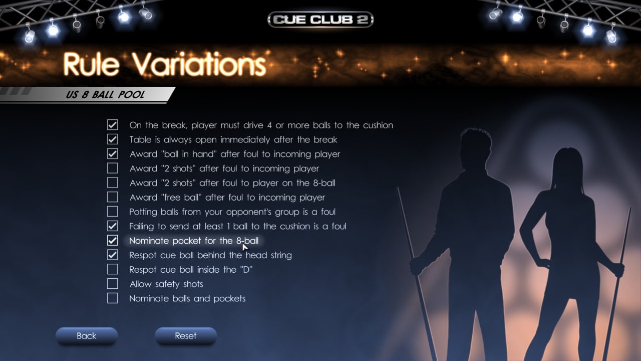 Видеоигра также известна под более коротким названием Cue Club 2. От первой части сиквел отличается улучшенной HD-графикой с поддержкой 4К-мониторов. Ещё тайтл совместим с сенсорными экранами. Разработчики добавили новый контент, а также улучшили искусственный интеллект виртуальных соперников. Появились ранее не встречавшиеся противники. Всего их тут 15. У ботов разные уровни сложности (от новичков до профессионалов). По мере прохождения открываются дополнительные этапы, а также выдаются призы. Трофеи можно посмотреть в виртуальном зале славы. Геймер путешествует по выдуманным барам и постепенно зарабатывает членские билеты, позволяющие ему посещать другие заведения. Если юзер будет участвовать в серьезных чемпионатах, то на его противниках будут официальная, а не повседневная одежда. Геймплей сопровождается джазовой музыкой. Саундтрек насчитывает 9 композиций.