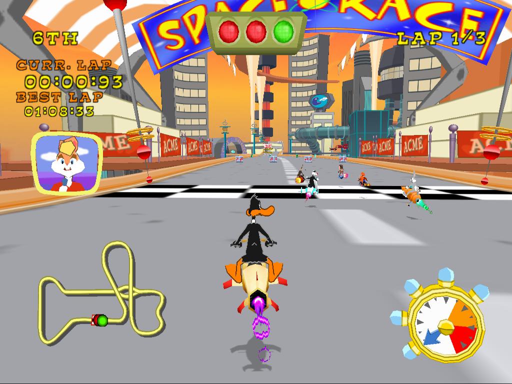 Looney Tunes: Space Race - это олдскульная аркадная гонка на разнообразных картах с участием сумасбродных персонажей Looney Tunes. Игроки выбирают одного из девяти гонщиков, включая Багза Банни, Даффи Дака, Порки Пига, Сильвестра, Таза и Марвина Марсианина. Цель игры проста: промчаться на своей ракете по двенадцати уникальным трассам и первым пересечь финишную черту. Однако не все так гладко. Остерегайтесь ловушек и препятствий, разбросанных по трассам, и будьте готовы к тому, что ваши противники будут играть грязно. К счастью, вы можете дать им отпор!