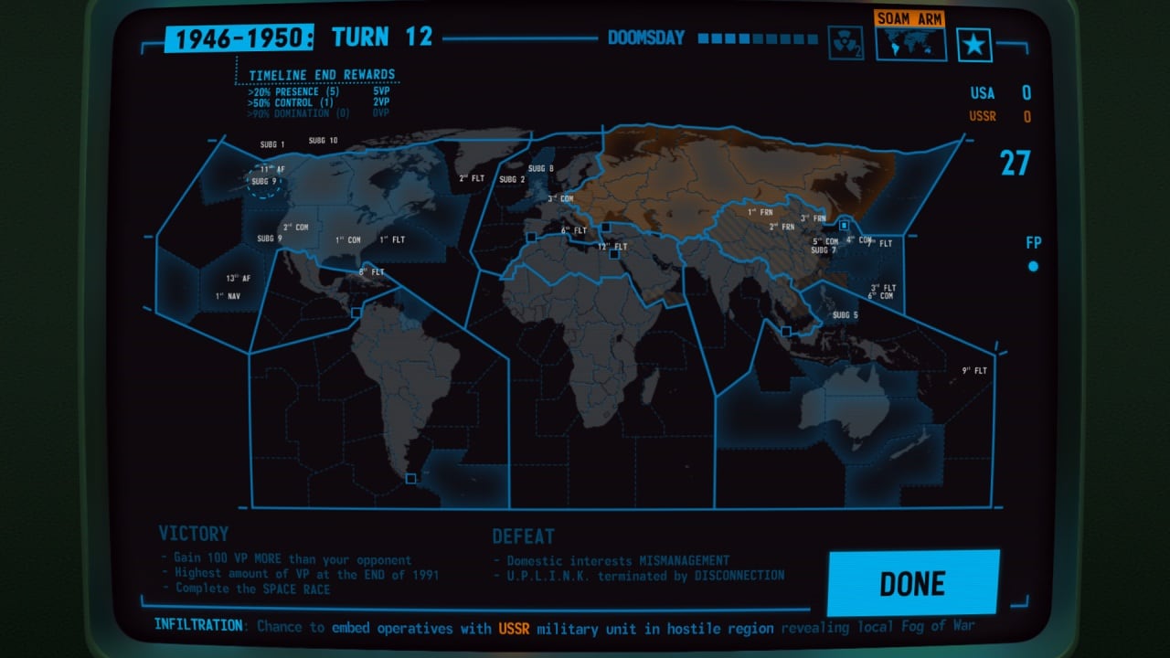 На пиратке Terminal Conflict можно бесплатно играть по сети с другом, сражаясь между собой как две сверхмогущественные державы. События развиваются в эпоху Холодной войны. Стилистика опирается на ретро-симуляторы из прошлого. Играть можно как локальной сети, так и по интернету онлайн. Возможность бесплатной сетевой игры позволяет взять под свое руководство одну из ядерных стран, пытаясь установить мировое господство.