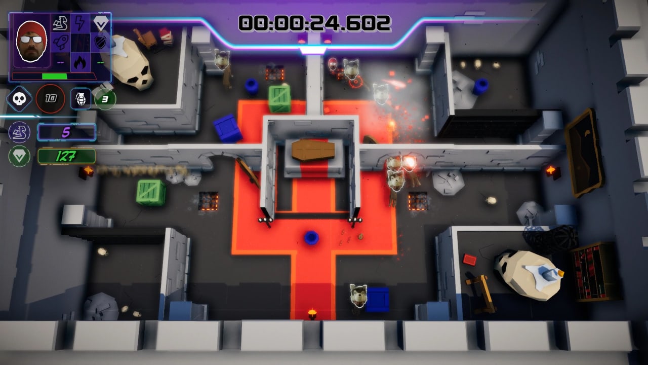 На протяжении всего этого хаоса игроки охотятся на мутировавших существ, зарабатывая очки и собирая сокровища для покупки бонусов. Способности передвижения, такие как телепортация и супервакуум, добавляют еще один уровень сложности, позволяя перемещаться по постоянно меняющимся аренам и добывать добычу. Сама завязка - причудливая: геймеры оказываются в роли клонов, вынужденных соревноваться в безумном игровом шоу на потеху садисту-шоураннеру. Booom-Slang! обещает неистовый игровой процесс, сочетающий в себе экшен, соревнования и нотки абсурда. Сражаясь с другими клонами или преодолевая одиночные испытания, игроки должны использовать быстрое мышление, тактические навыки и здоровую дозу терпимости к хаосу, чтобы добиться победы.