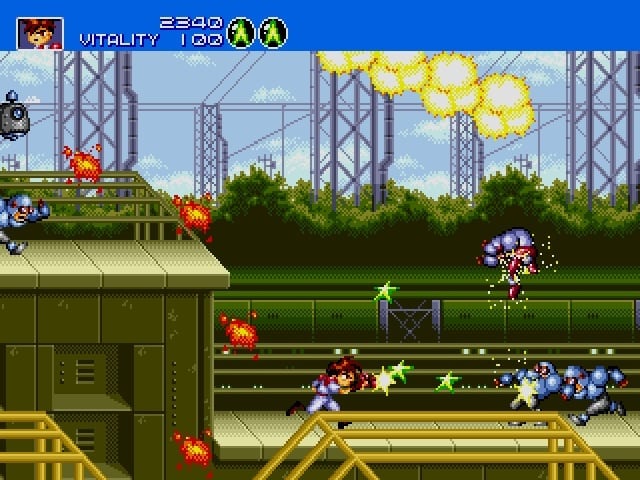 По окончанию уровня здоровье повышается до максимального значения. Позволяется задать 2 позиции для стрельбы: фиксированную или свободную. в Gunstar Heroes Доступен стартовый пак оружия: выстрел с самонаведением, молниевый бластер, огнемёт и пулемёт. Все виды пушек имеют достоинства и недостатки.