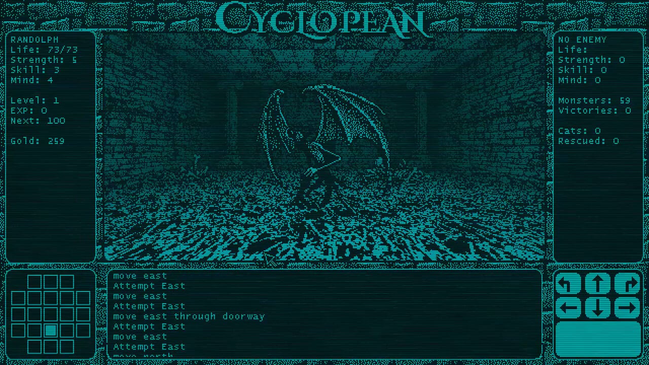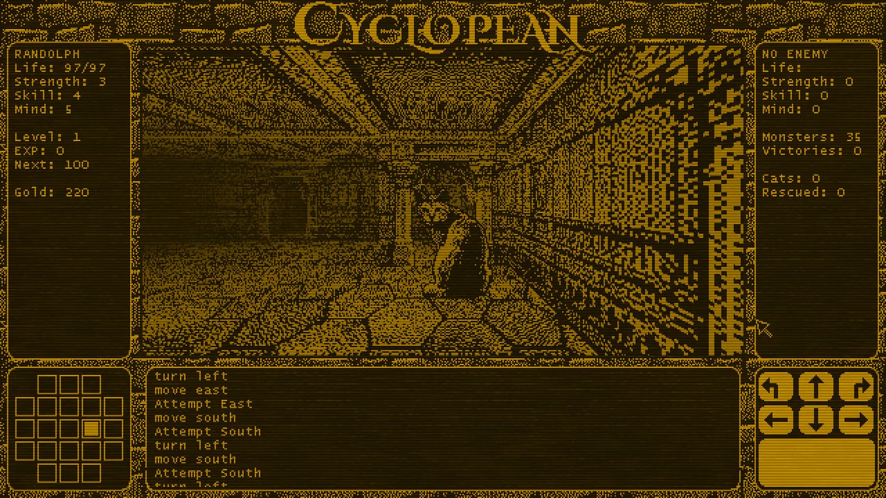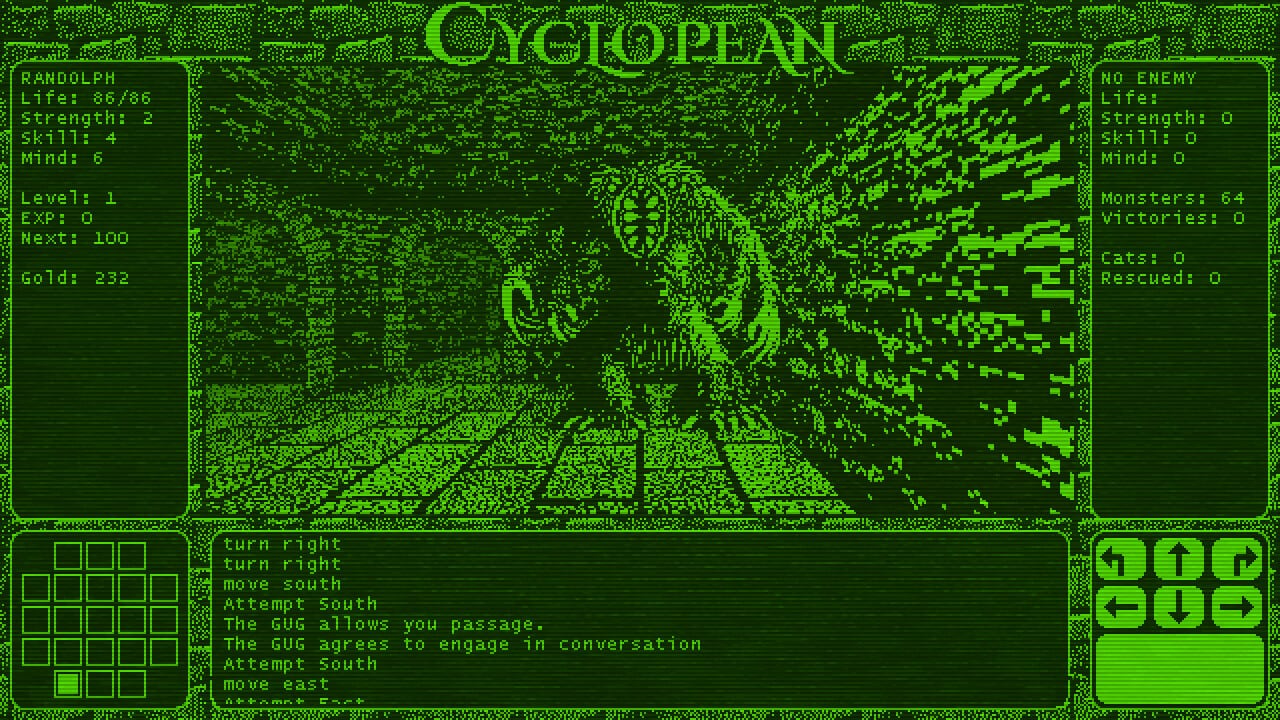 Некоторые союзники появляются вместе с геймером, а других приходится открывать в процессе исследования и взаимодействия с миром. Cyclopean остается верной механике старых CRPG, напоминая классику вроде Ultima и Questron. Тайтл переключается между двухмерным видом сверху вниз для исследования и трехмерной перспективой от первого лица для прохождения подземелий. Юзеры начинают со случайно выбранного мечтателя, персонажа с заданными способностями и экипировкой, но его можно перебросить, чтобы получить потенциально лучший вариант.
