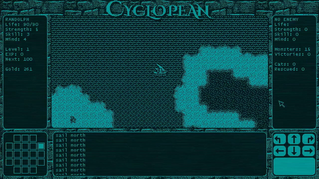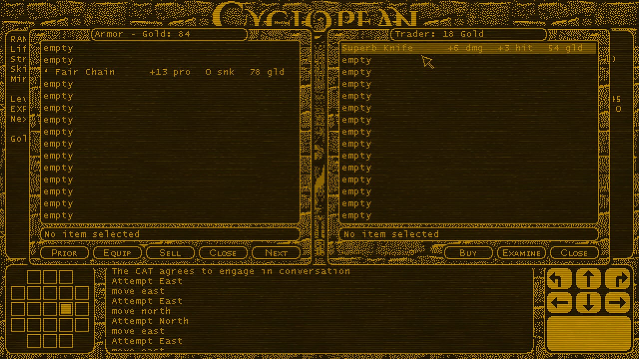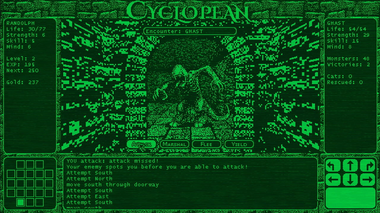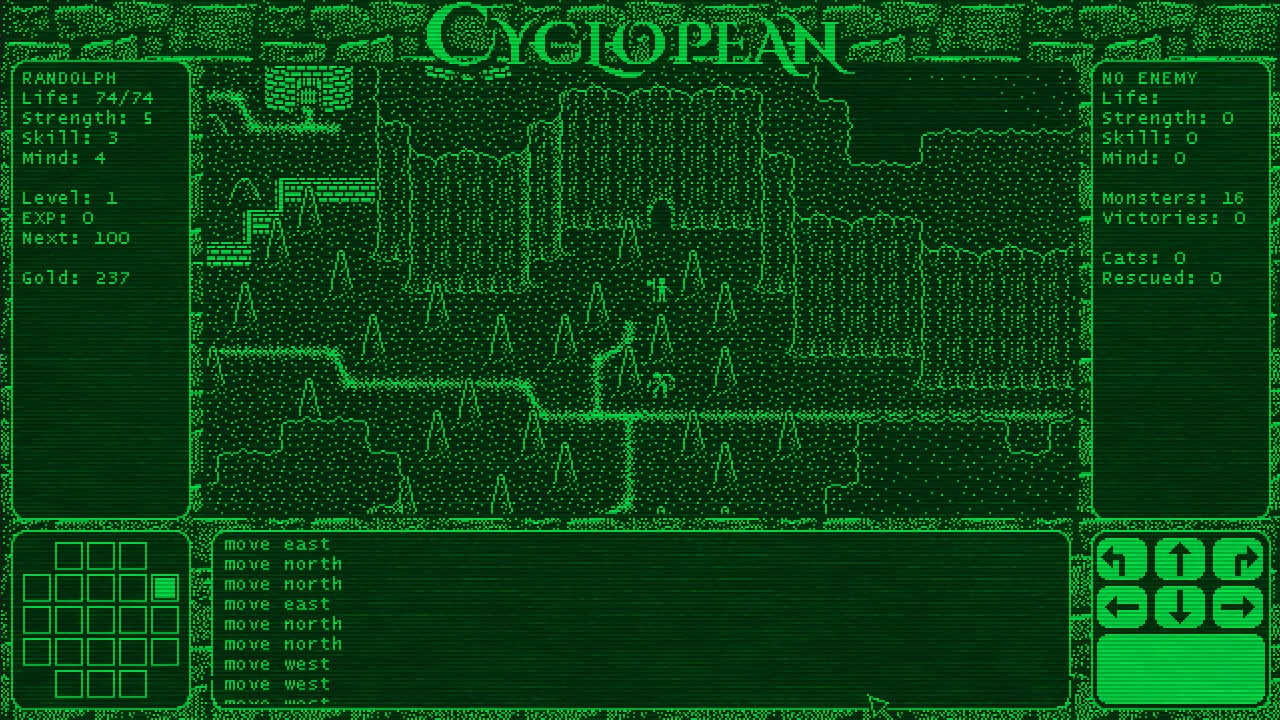 Некоторые союзники появляются вместе с геймером, а других приходится открывать в процессе исследования и взаимодействия с миром. Cyclopean остается верной механике старых CRPG, напоминая классику вроде Ultima и Questron. Тайтл переключается между двухмерным видом сверху вниз для исследования и трехмерной перспективой от первого лица для прохождения подземелий. Юзеры начинают со случайно выбранного мечтателя, персонажа с заданными способностями и экипировкой, но его можно перебросить, чтобы получить потенциально лучший вариант.