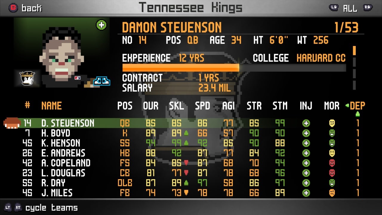 Погружение в Legend Bowl выполнено в форме гибридного аркадного футбола-регби и симулятора, в котором пользователям приходится заниматься полноценной настройкой команды, а потом отправляться на соревновательные матчи против других клубов. Игра позволяет подобрать желаемых спортсменов и создать уникальный футбольный клуб, в котором придется заниматься с игроками и тренировать их. Геймеры будут наслаждаться пиксельной графикой, позволяющей погрузиться во времена олдскульных проектов.