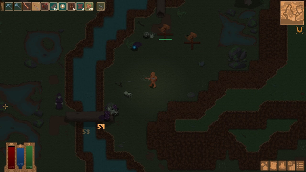 Однопользовательская игра предоставляет игроку возможность для длительного пребывания в виртуальном мире, созданном инди-студией, ведь контента предостаточно. Также, каждое подземелье, имеющееся на острове, обладает свойством рандомной процедурной генерации, что делает каждое попадание под землю уникальным. На просторах мира, использующего камеру сверху, бродят 40 видов агрессивно настроенных недругов и 5 боссов, охраняющих поистине редкие предметы и ресурсы. Собранные богатства и дорогое снаряжение можно продавать специальным торговцам в поселениях. Делать это нужно для получения местной валюты, позволяющая докупать недостающих зелий или прочего расходного материала.