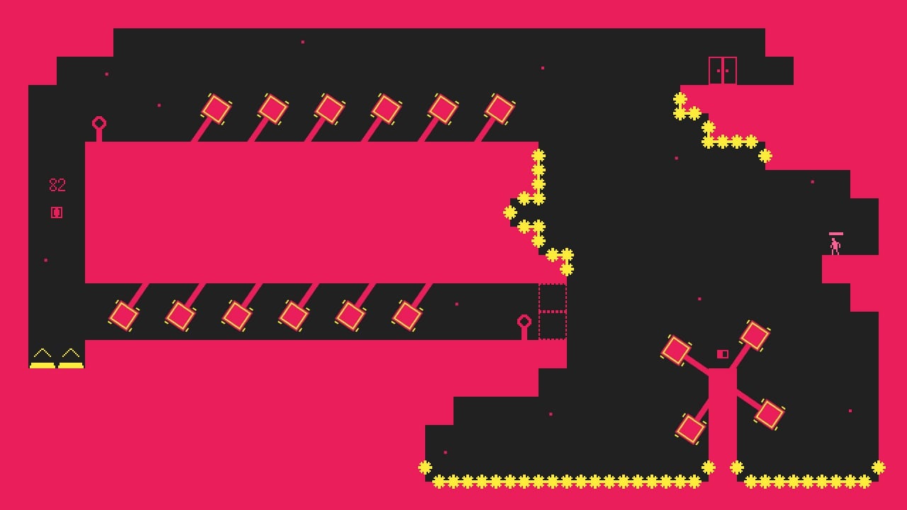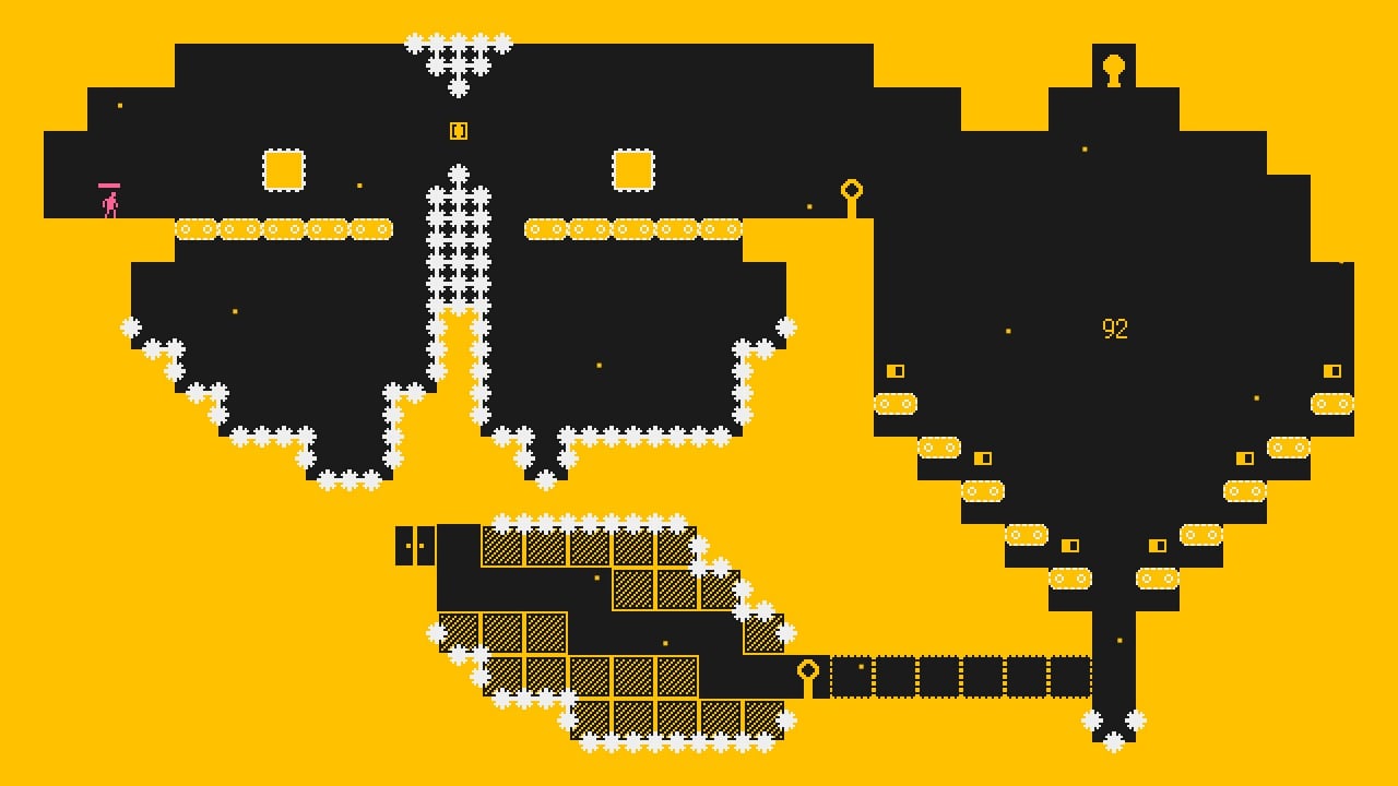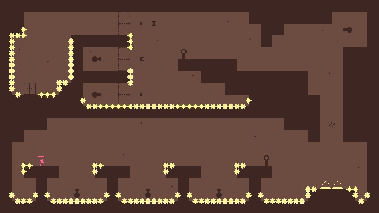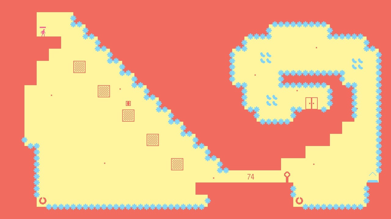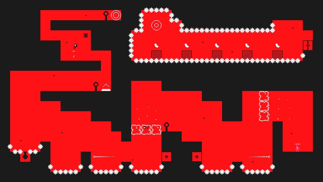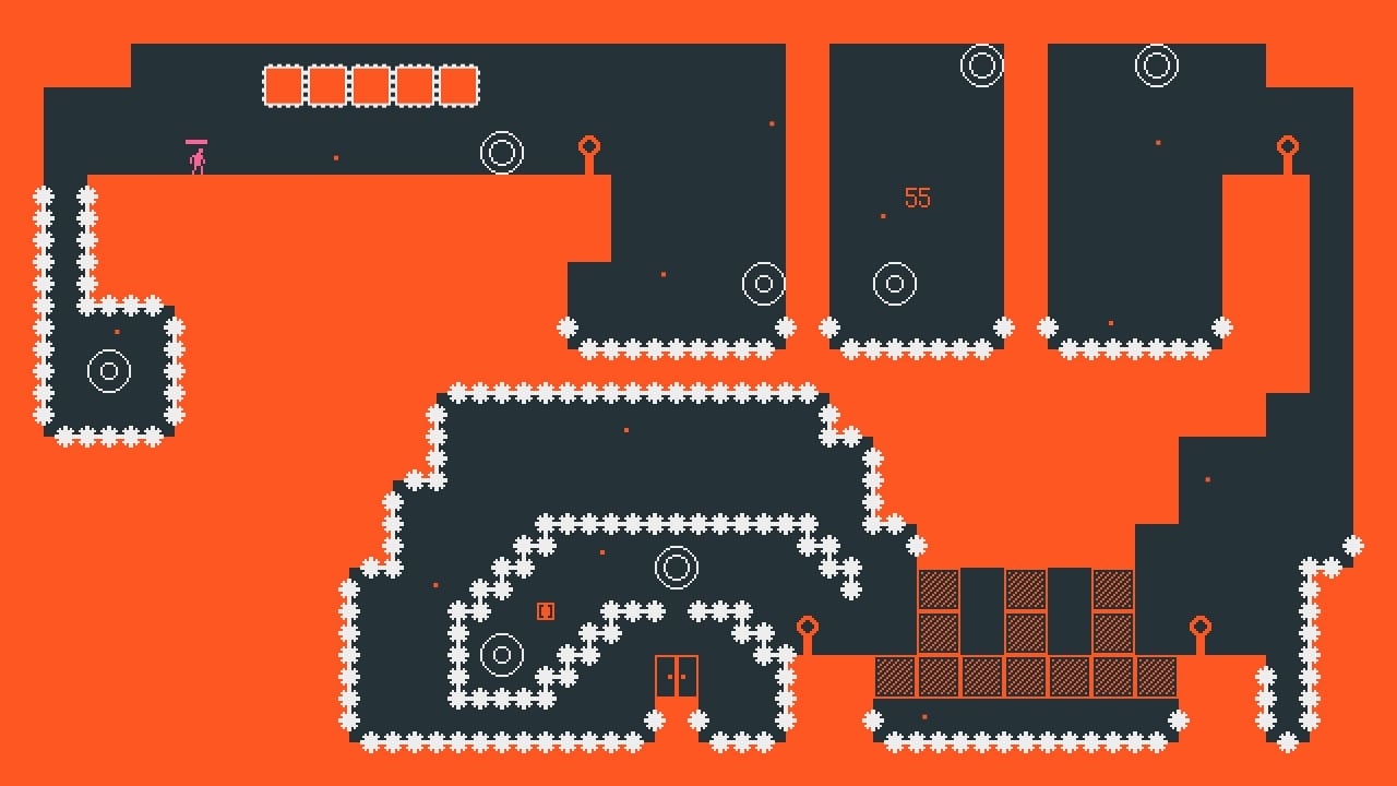 Для прохождения этапа нужно добежать до выхода. Иногда по пути к цели надо искать переключатели, что открывают двери, и убирают преграды. Присутствуют контрольные точки. В проекте около 20 ловушек. Это различные шипы, исчезающие платформы, самонаводящиеся ракеты, движущиеся лезвия, турели и т. п. Часть объектов, наоборот, помогают герою. Это телепорты, батуты, лифты и всё в таком духе.
