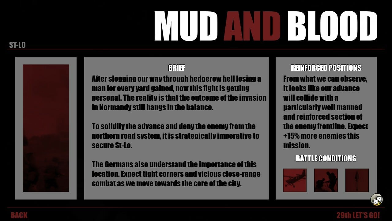 Переосмысленный проект Mud and Blood представляет собой перестрелки между двумя сторонами конфликта, где пользователю приходится наблюдать за происходящими событиями. Сеттинг переносит в период Второй мировой войны, где сходятся в битвах солдаты. Обновленный движок и улучшенный искусственный интеллект позволяет опробовать старую классическую флеш-игру, наполненную нововведениями в плане функций и графической составляющей, погружающей в процесс геймплея.