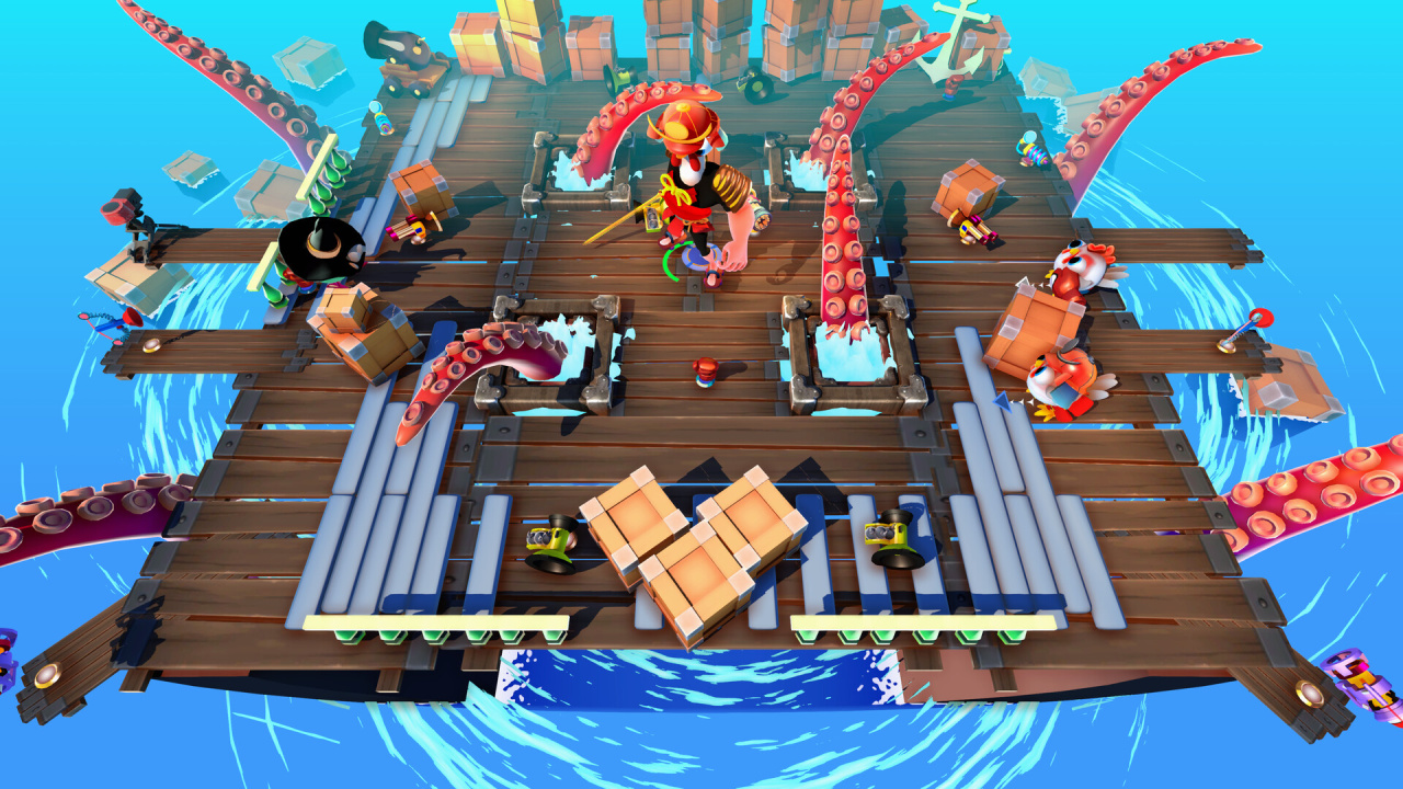 Chickenoidz Super Party - многопользовательский шутер с видом сверху вниз, рассчитанный на четверых. Играть можно как локально, так и по сети через Remote Play. В игре представлено множество видов оружия, специального снаряжения и мутаций, с помощью которых можно уничтожать противников и все вокруг. Она вдохновлена классическими аркадными играми 90-х годов, но с изюминкой: вы играете за цыплят. Вы можете выбрать более пятнадцати различных нарядов для своей курицы: панк, самурай, ведьма и т.д. Вы также можете превратиться в гигантского цыпленка, съев секретную формулу ДНК, что даст вам дополнительную силу и особую атаку.