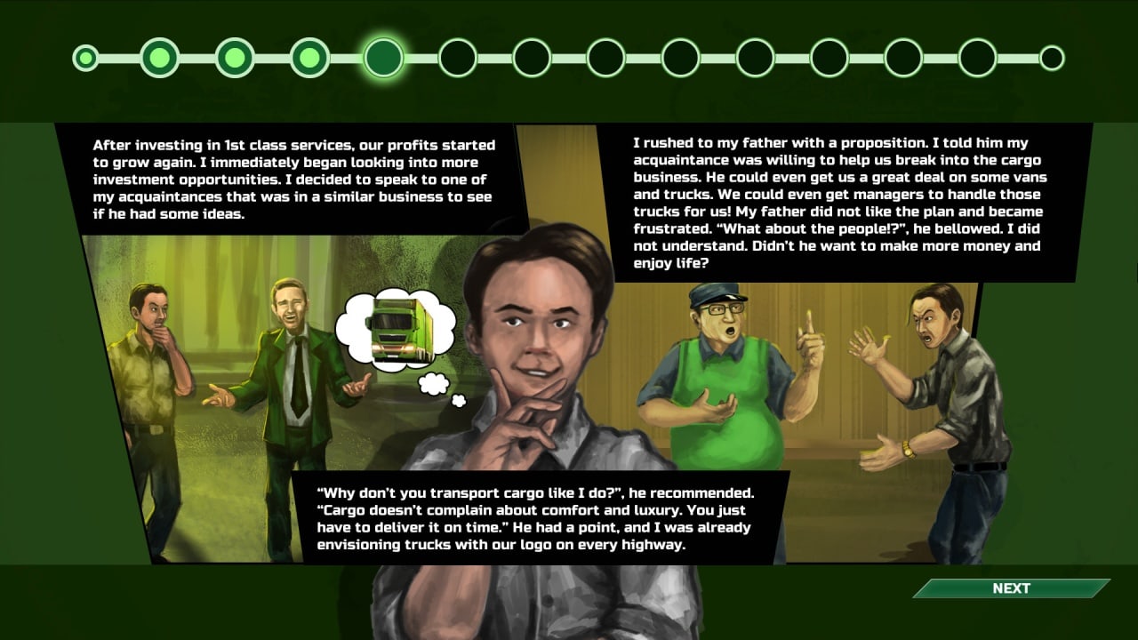 Автопарк включает четыре группы транспорта и состоит из 27 едининц, вклюая автомобили, самолеты, корабли и поезда. Требуется на каждый маршрут выбрать менее затратный способ доставки товара. По мере того, как будут совершаться сделки, можно улучшать имеющиеся машины или покупать новые, а также нанимать более опытных сотрудников.