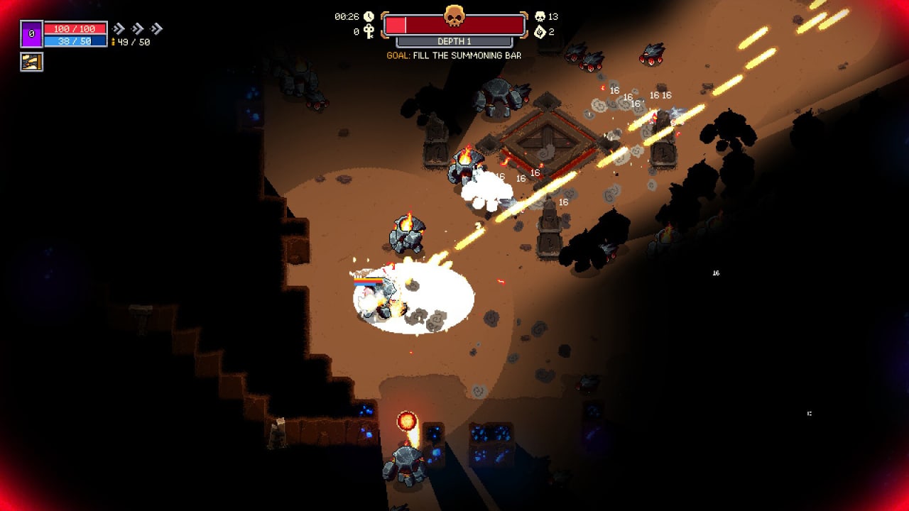 Все умения тут активные. Они перезаряжаются 30-60 секунд после каждого использования. Эти скиллы позволяют устанавливать временные турели, ненадолго увеличить скорость стрельбы и так далее. На вылазку разрешают брать с собой только один такой стартовый навык. Для этих способностей тоже можно подбирать моды с баффами и дебаффами. Создатели проекта вдохновлялись культовой инди-игрой Vampire Survivors. Сражения проходят в пещерах. Можно ломать стены кувалдой, чтобы добывать руду. За неё дают опыт. Ещё его выдают в награду за убийство противников. При сборе достаточного количества экспы у протагониста повышается уровень. На каждому левелапе надо брать один из трёх случайных перков. Их можно рероллить.