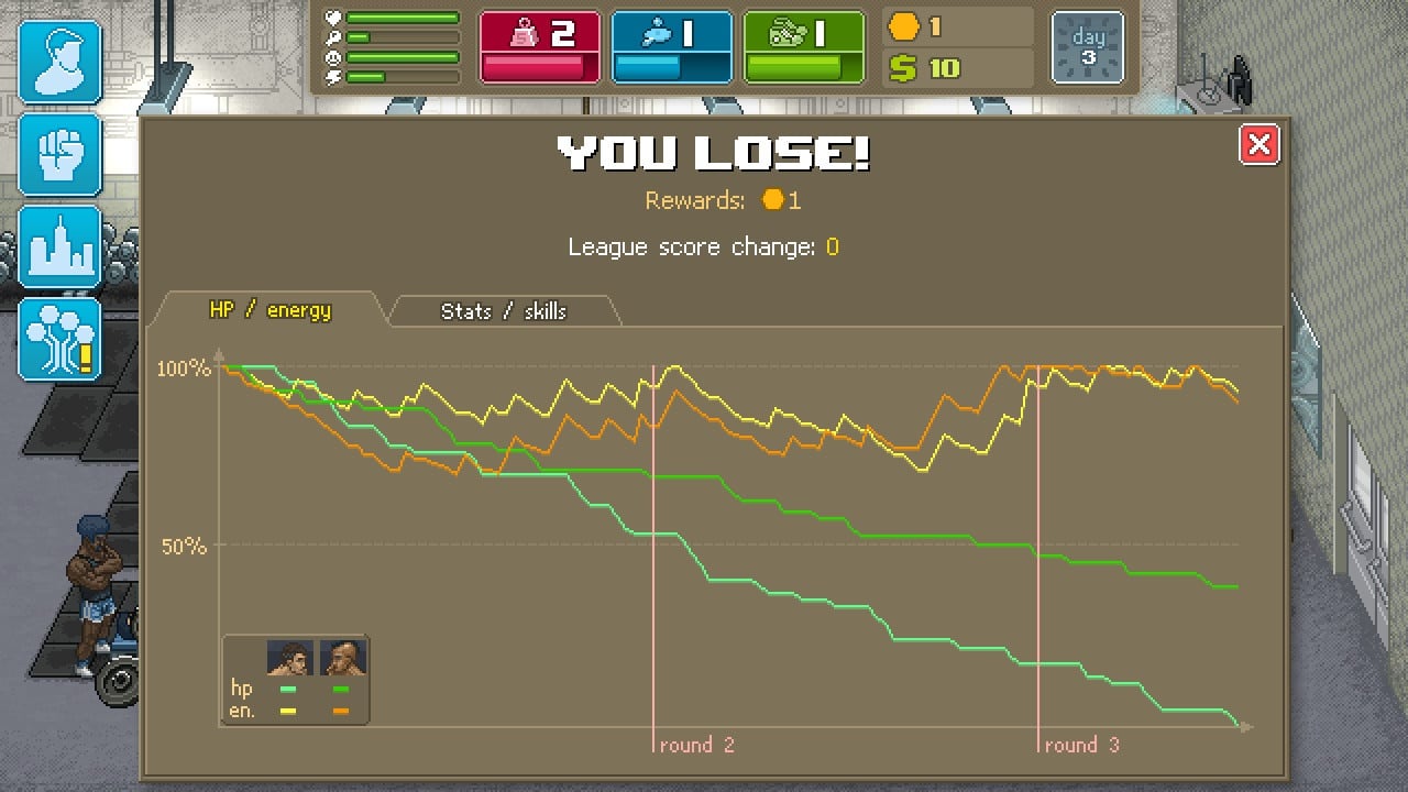 Также есть боевые характеристики: сила, выносливость и ловкость. Качать их можно и нужно разными способами. Одни из них: отжимания в гараже, занятие в тренажерном зале за деньги. Также можно накопить некую сумму и купить снаряд домой. Игра отлично сбалансирована, все эти улучшения нельзя выполнять постоянно, так как на начальном уровне денег у вас почти нет. А на них все построено. Сражаясь в спаррингах, игрок получает скил-поинты, которые может тратить на умения и улучшение навыков. Существуют и уличные бои, в них делаются ставки и можно неплохо подзаработать. Но этот вариант уже для опытных бойцов. Punch Club заслуживает внимания любителей различных «менеджеров», а также 8битной картинки. И помните, первое правило панч клаба – никому не говори о панч клабе.