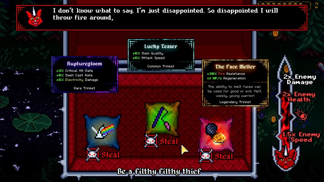 В игре также есть выразительный бой с комбо и механикой отмены. Вы можете украсть безделушки у Фурцифера, хозяина подземелья, что злит его, но дает вам больше силы. Вы также можете видеть атрибуты своего персонажа и комментарии Фурцифера к ним. Вы можете сравнить свои достижения с другими игроками в таблице лидеров. В игре есть оригинальный саундтрек, в котором смешаны оркестровые и электронные звуки. Продолжительность игровых сессий составляет около 20 минут.