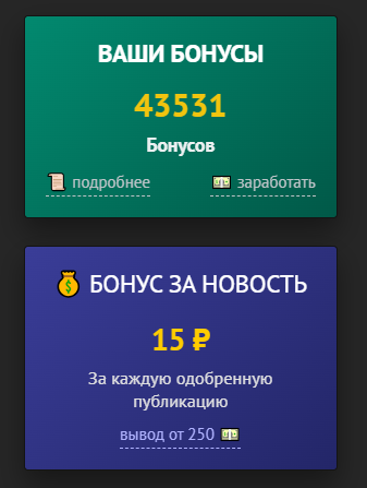 На нашем сайте вы можете зарабатывать, добавляя новости! За каждую одобренную публикацию вам начисляются бонусы, которые можно обменять на реальные деньги.